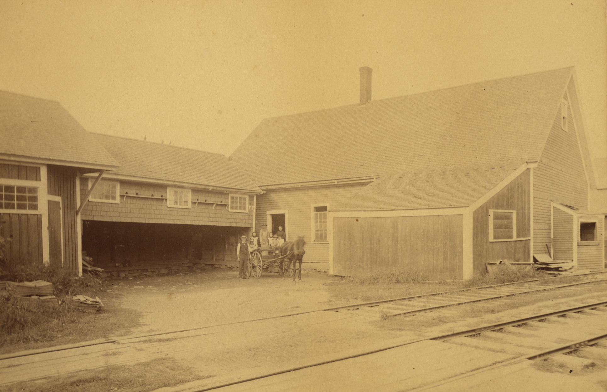 A gristmill was built on the Smith River at Wolfeboro Falls as early as the spring of 1771. The owners were A. R. Cutter and David Sewall. They owned the mill for many years (unspecified), later there were other owners. A miller was in charge of the operations. This 1886 photo is of the miller, John Patterson, his wife Emily (both in the back), son Emil?, age 13 (in the wagon seat), and daughters Margaret and Cora, ages 7 and 6. The man standing at the left is the horse's owner.
