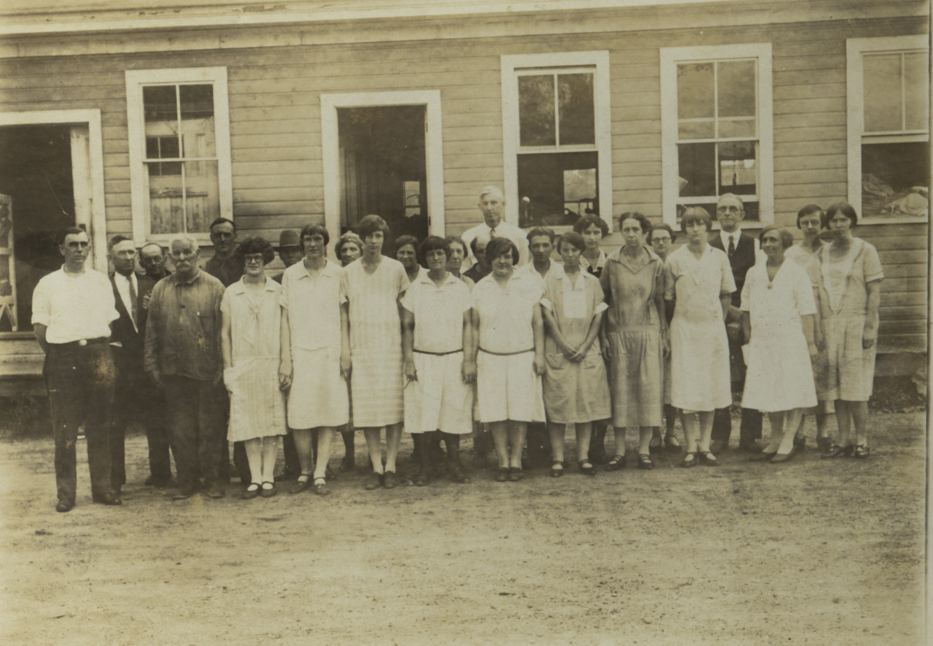 Staff of Wolfeboro Laundry on Center St. at Grove St., Wolfeboro Falls, c. 1930's. Harry E. Libby, owner, is in the suit and tie on the left. The building dates to 1925, replacing the previous building that was demolished in a 1924 boiler explosion. In 1936, the staff level was reported as 16 in the winter and 40 in the summer. This commercial laundry operated until 1967.