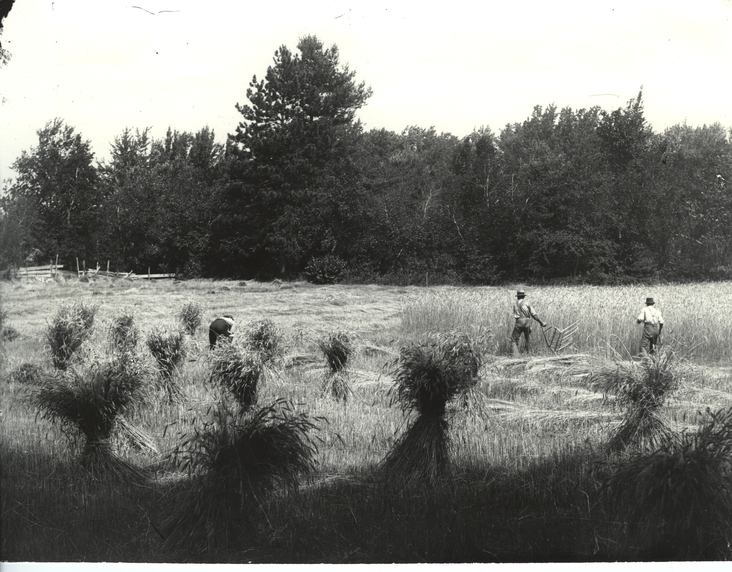 Cutting the hay is the first step in the harvest. Photo is c. 1890's. Agriculture was an important local industry for nearly 200 years. The second man on the right is using a cradle scythe, a design that lays the cut stalks in neat piles, making it easier to pick up. Takes a little extra training to use than an ordinary scythe, which has only a handle and a blade, but is a definite time saver.