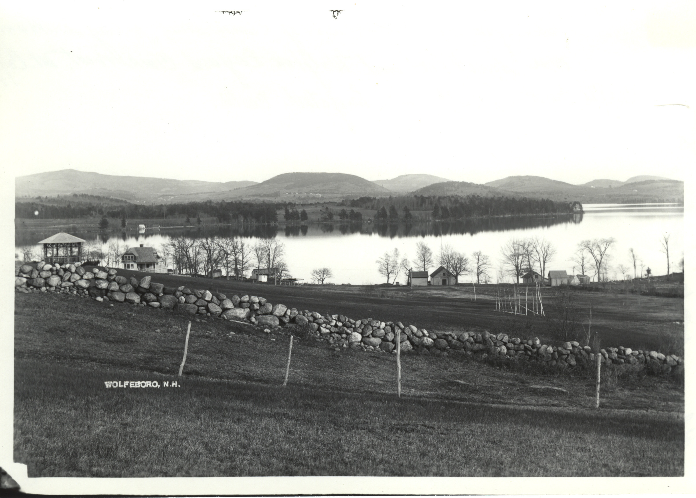 View from Pleasant St. looking across Sewall Rd. and Wolfeboro Bay. Copple Crown Mt. is in the left background and Mt. Longstack is in the center. Clark's Point is on the right in the Bay. C. 1910.