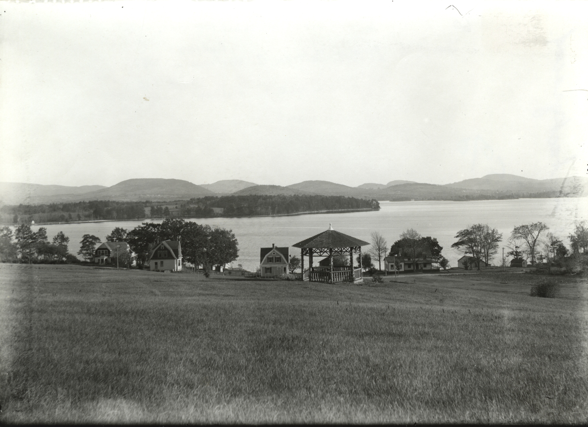 View from Pleasant St. looking across Sewall Rd. and Wolfeboro Bay. Mt. Longstack is in the left background. Clark's Point is right of center in the Bay. C. 1910.