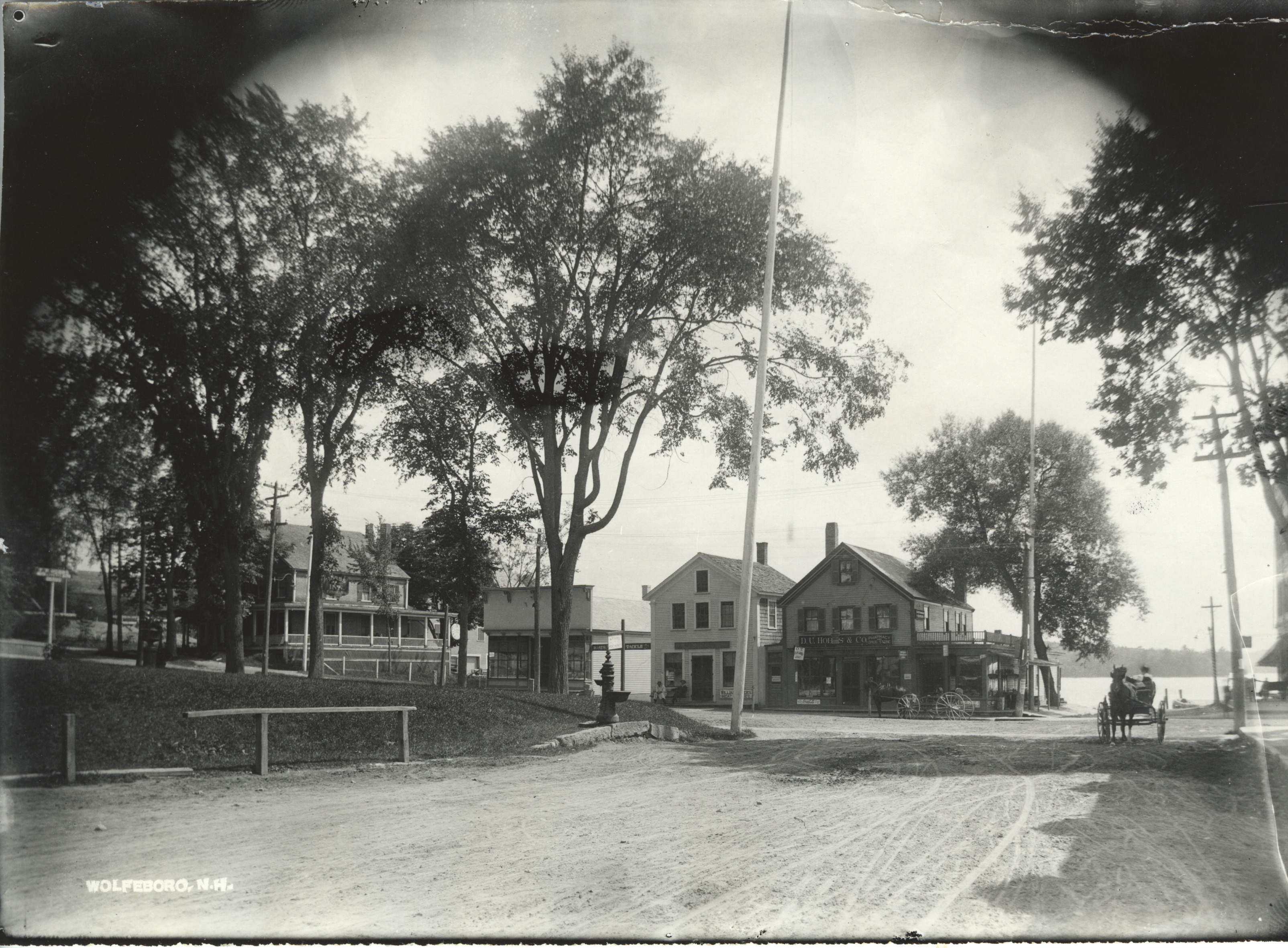 This view is taken from Central Ave. and shows the junction with South Main St., c. 1905. Wolfeboro Bay is in the background. The left building is the Belvue House, built 1847, later named Lake Shore House, 1892, and the Ann Inn, 1921. Razed in 1940 for a gas station, the site is now Town & Cate Park. The building in the middle of the photo is William Rogers Meat Market. On its right is D. U. Hobbs & Co. Drug Store. The small one-store building to the right of Hobbs is Harvey C. Kalloch's convenience store. The telephone exchange was once located there. The tall pole to the right of Kalloch's is the Town Liberty Pole, a prominent landmark for many years. Over 100 feet tall, the pole was a gathering spot for speeches and special announcements. Note the watering station in the center; that corner is now where the Post Office is located.