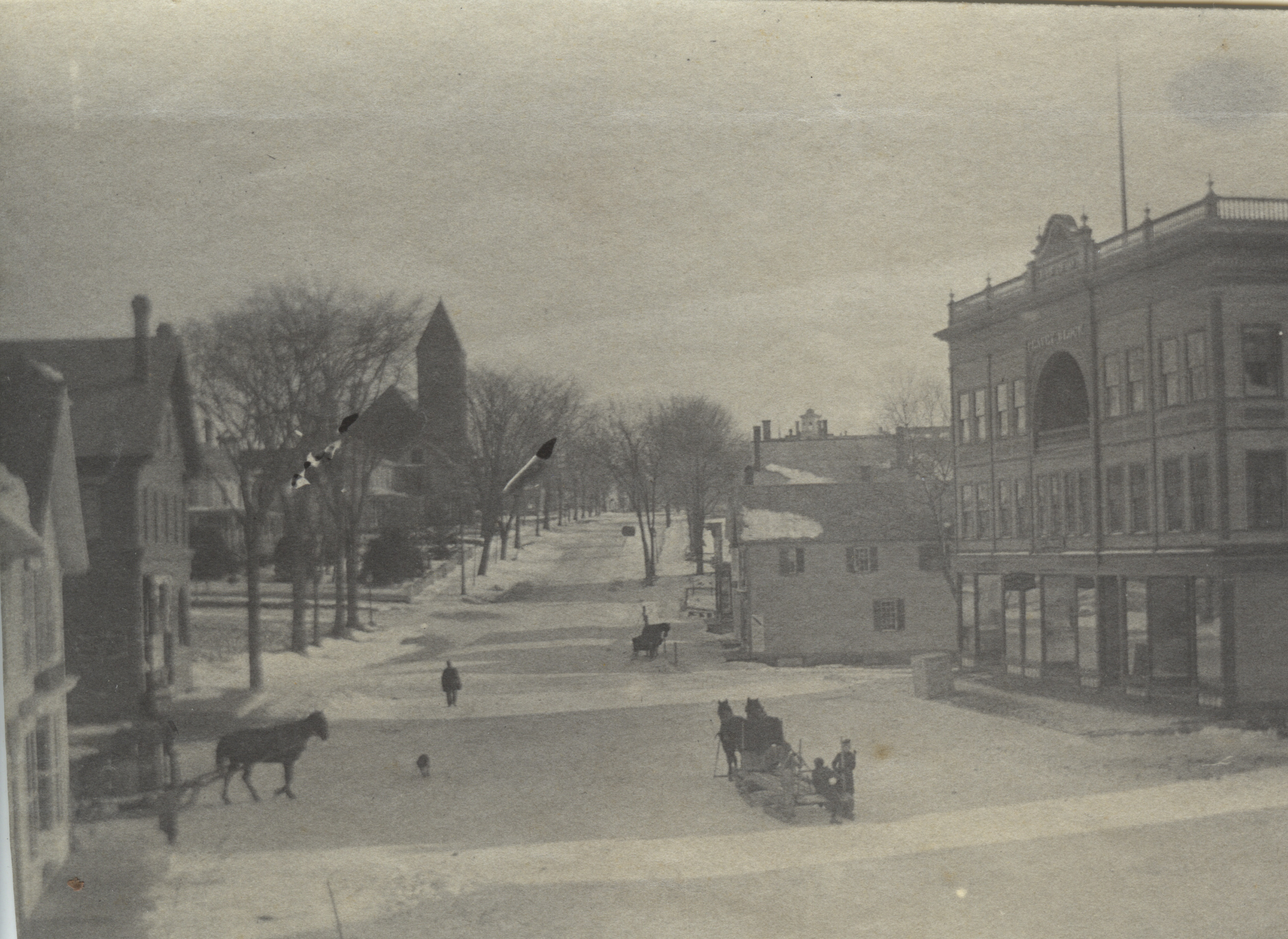 View from bridge area look toward Brewster Memorial Hall, early 1900's. Peavey Block, now Avery Block, is on the right. Horse and wagon on the left is coming out of Railroad Ave., with original Bank Building just past the intersection. Notice the wagons have skids, and the one in the center appears to be a snow roller.