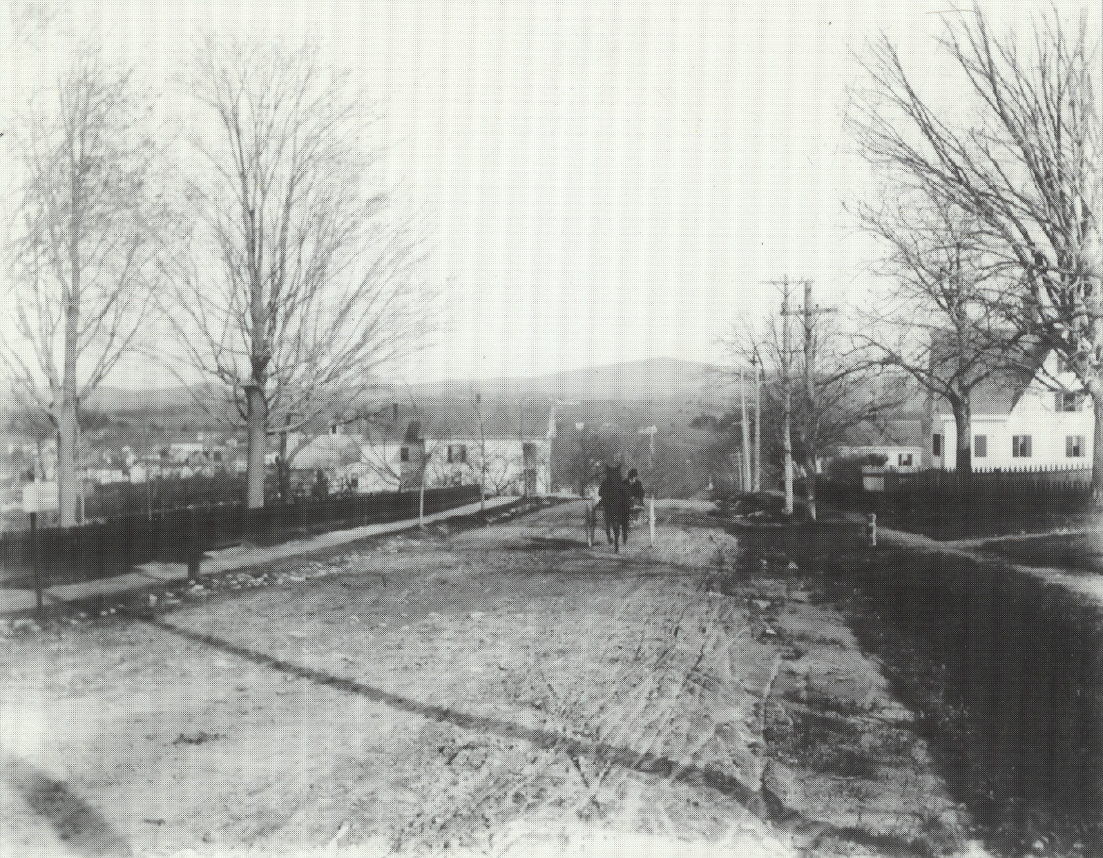 View from North Main St. at the top of the hill looking southeast, c. 1900. Copple Crown Mt. is in the background. Penn Varney house is on the left; Orville Porter house is on the right.