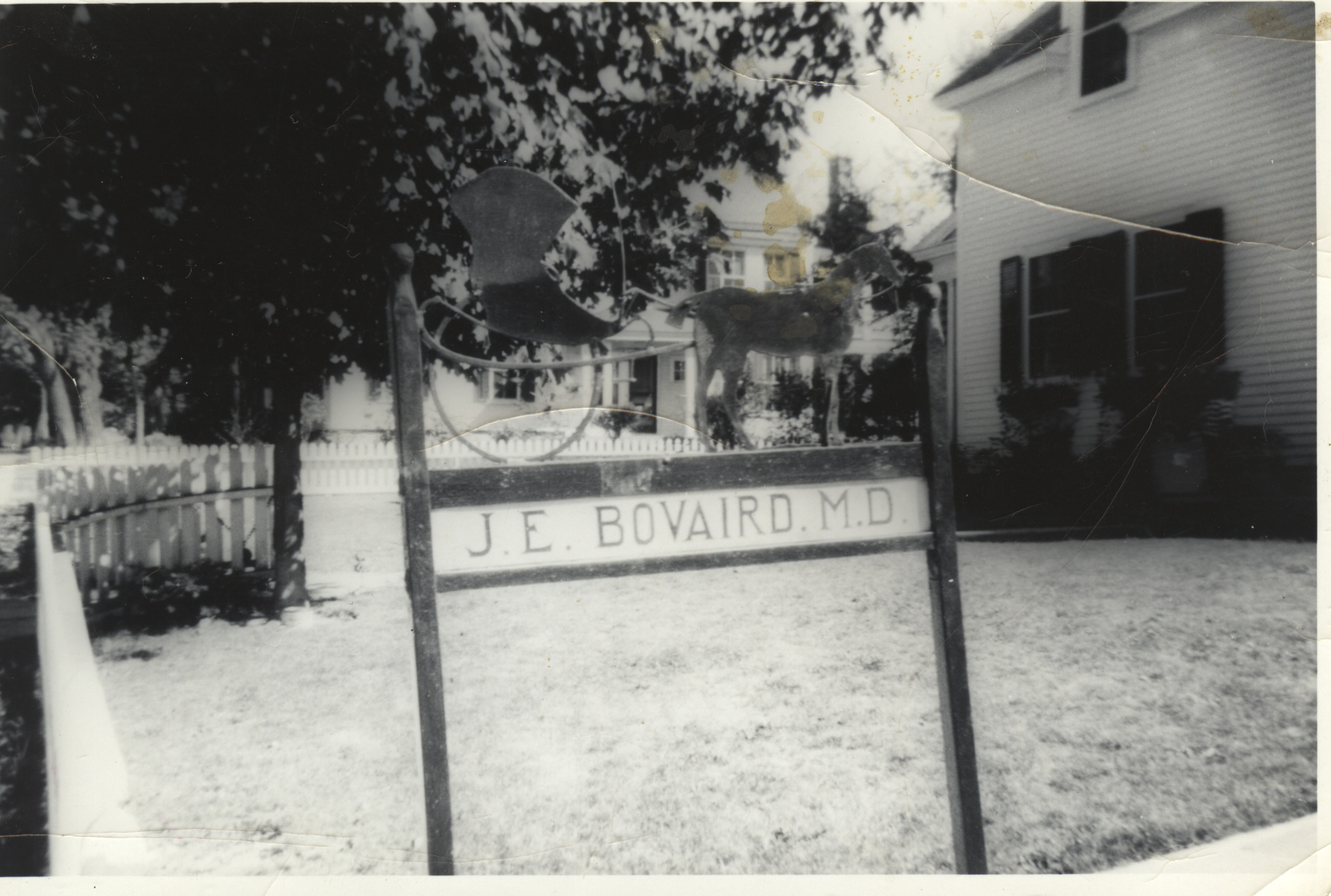 Sign is possibly in front of Dr. James E. Bovaird's house on School St, c. 1940's. Unique horse and buggy decoration is a reminder of the days when doctors actually made house calls.