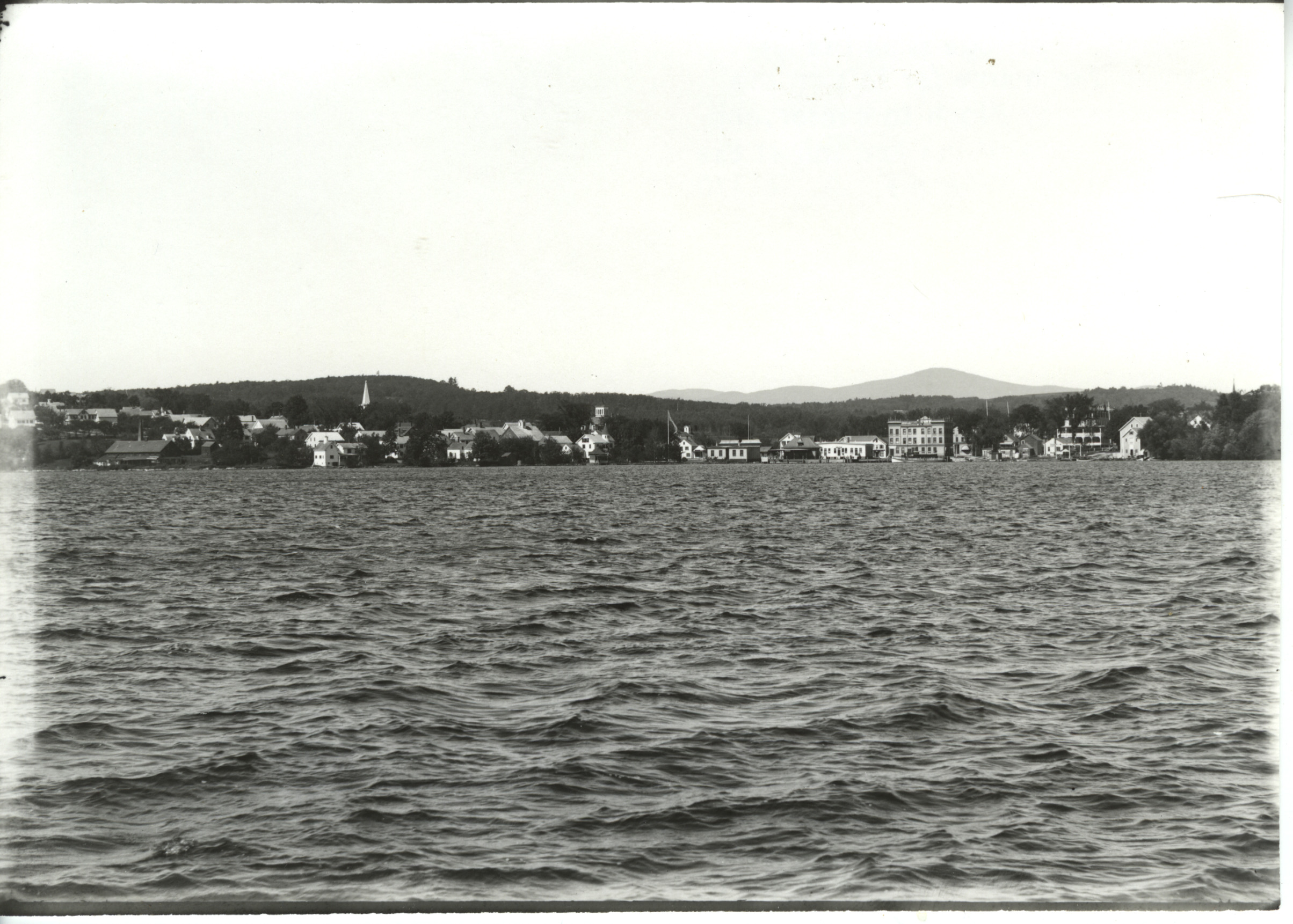 Downtown from the Bay, c. 1900. L-R, Joseph Varney Tannery, First Christian Church steeple on North Main St., large Peavey Block on the right, and the back of the Lake Shore House (later the Ann Inn, now Cate and Town Park) on the far right.