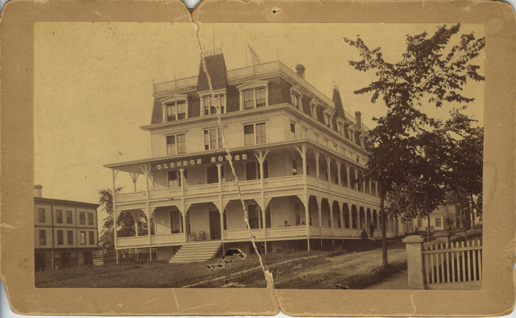 Built as the Glendon House in 1872, this impressive 4-story hotel with a mansard roof was in the center of downtown. Later, it was the Wolfeboro Hotel, New Wolfeboro Hotel, Hobbs-Is-Inn and Hotel Elmwood. It was razed in 1935 to build the present Wolfeboro Post Office. Photo was taken c. 1894, when it was the Glendon House.
