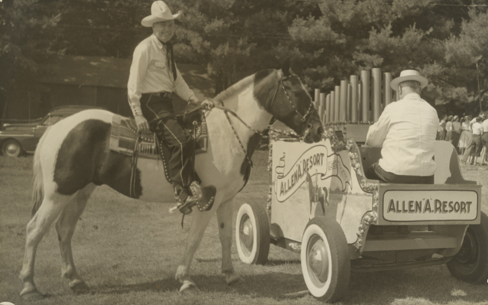 The Allen "A" Resort on Rte. 28 was begun in 1935 by Allen H. and Lillian L. Albee. The enormous resort provided lodging, meals and entertainment and expanded to as many as 80 cabins, 5 lodges, the 1810 House, a theater (quonset hut, now the Boat Museum), dude ranch, beach on Lake Wentworth (now Albee Beach), several dining halls and a motel. After many successful years with hundreds of guests each week during the summer, a period of decline began as Allen H. Albee, in poor health, sold the resort. In the early 1980's, only the motel was active. This 1950 photo has a horse and rider from the dude ranch and the resort's calliope, which was used for entertainment and parades. See also, photos 35, 36, 55-71 in this group.