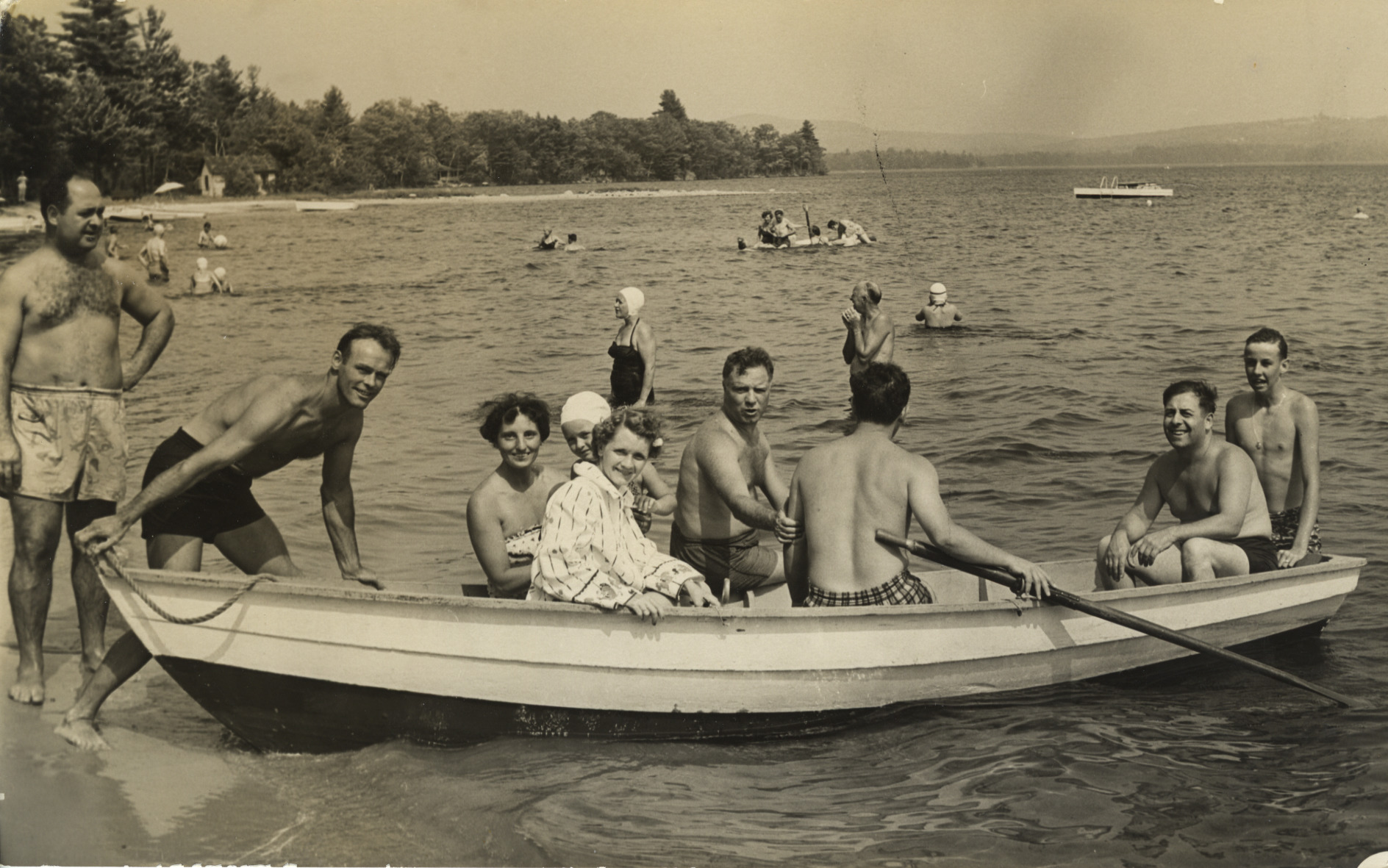 The Allen "A" Resort on Rte. 28 was begun in 1935 by Allen H. and Lillian L. Albee. The enormous resort provided lodging, meals and entertainment and expanded to as many as 80 cabins, 5 lodges, the 1810 House, a theater (quonset hut, now the Boat Museum), dude ranch, beach on Lake Wentworth (now Albee Beach), several dining halls and a motel. After many successful years with hundreds of guests each week during the summer, a period of decline began as Allen H. Albee, in poor health, sold the resort. In the early 1980's, only the motel was active. This 1954 photo is the resort's private beach on Lake Wentworth, which was bought by the town in the late 1980's and is now the Allen H. Albee Beach. See also, photos 35, 36, 55-71 in this group.