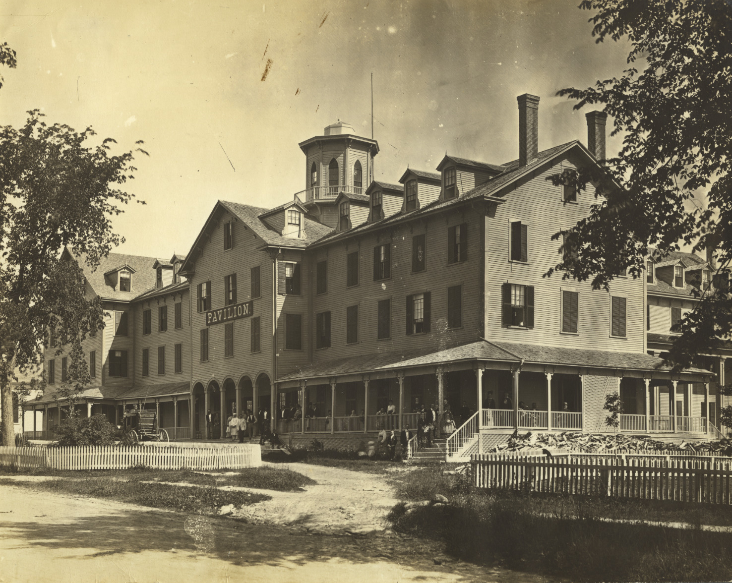 The Pavilion Hotel at Pickering Corner was built in 1849, became the Kingswood Inn in 1890, and was sold and removed in 1899. This photo was taken c. 1880's. This view is the front and right side seen from South Main St. The hotel was the largest one ever built in Wolfeboro, with an advertised capacity of 300 guests. Their land extended to the lake, and had a boathouse, bowling alley and diving platform on the shore. The site is now Brewster Soccer Field.