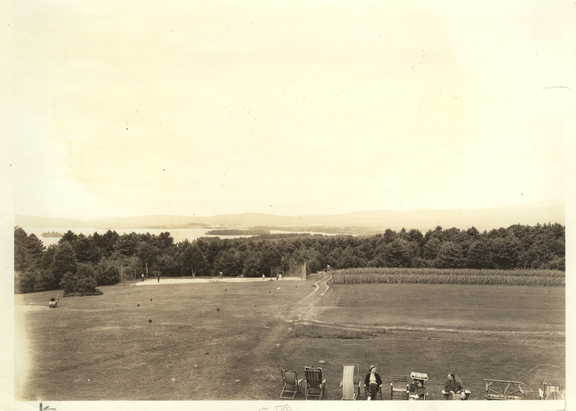 This is the grounds of Pierce Camp Birchmont, with a small golf course, a tennis court and lounging area. A cornfield is on the right. The Camp is located atop Mt. Delight, a hill overlooking the west side of Lake Wentworth, accessed from Rte. 109 near the Brookfield Town Line. The extensive property of about 200 acres includes about 2000 feet of shorefront on Lake Wentworth. The facility opened as Camp Birchmont in 1907 as a summer camp and school for girls. From the early 1920's until 1951 (except for World War II}, it became Birchmont Camp, a summer lodging facility with cabins, and sometimes tent space, for families and adults. In 1951, now owned by Forrester W. Pierce, Sr., the named was changed to Pierce Camp Birchmont and is still operating today.
