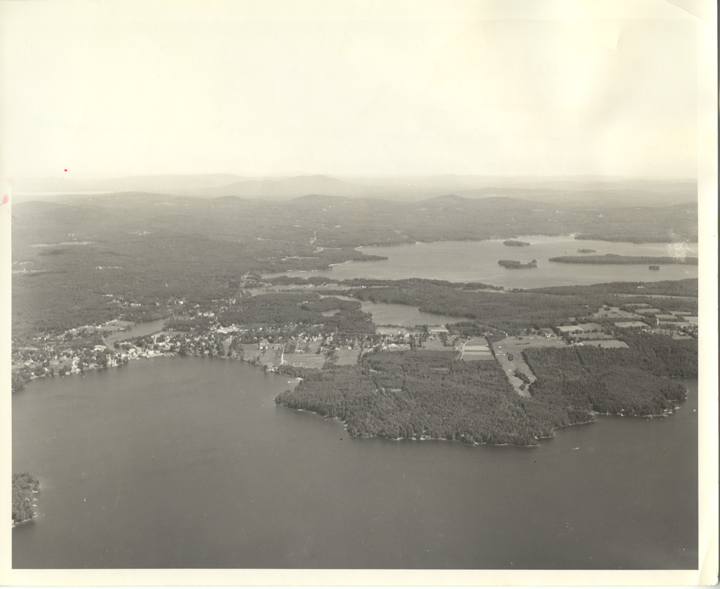 View taken from Wolfeboro Bay, Sept. 1960. Foreground shows downtown, Brewster Campus, and Kingswood Golf Course toward the right. Crescent Lake is in the middle and Lake Wentworth is in the background.