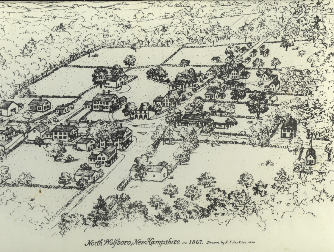 Aerial sketch of North Wolfeboro, drawn by R. F. Jackson, 1936. In the center is Dimon's Corner, looking north. The roads depicted are: north-Trask Mt. road; east-Stoneham Rd.; south-Haines Hill Rd.; and west-North Wolfeboro Rd. This area was a self-sufficient community with farms, stores, church and school. The one-room school is the farthest building on the right (with a flag).