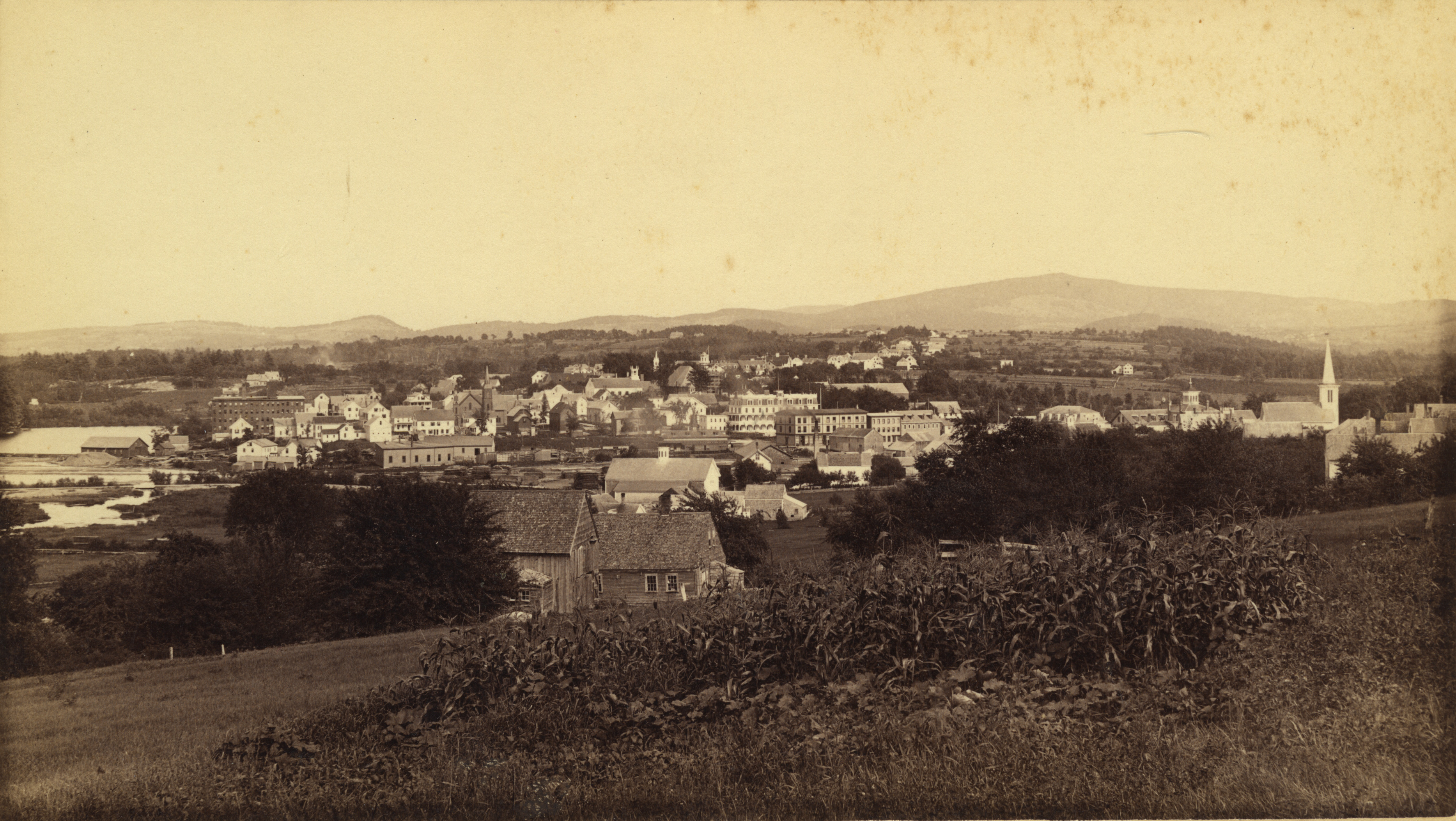 View from North Main St., looking at downtown, c. 1885 (before Brewster Memorial Hall was built). Copple Crown Mt. on the right, Tumble Down Dick Mt. on the left. First Christian Church is the steeple on the right. The Glendon House, now the site of the Post Office, is just right of center. The Unitarian Church Steeple is just left of center, now the site of the Village Players Theater, and the large Shoe Factory is on the far left.