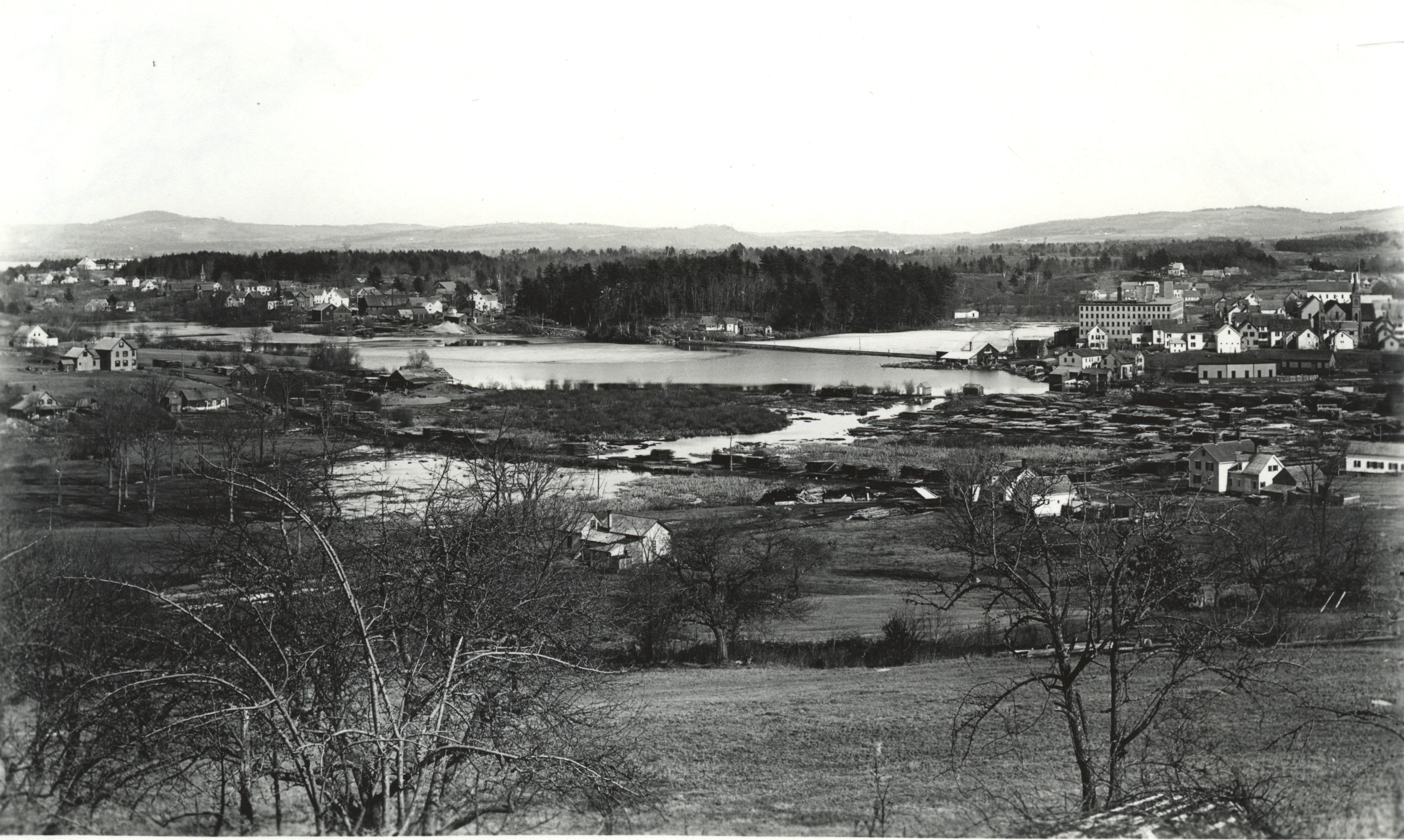 View from North Main St., looking east, c. 1887. The road in the middle is Bay St. On the right is Clow's Lumber Mill, with the 4-story Shoe Factory on Factory St. just above. The largest body of water was known as Front Bay (now commonly called Back Bay). The straight object above is the railroad tracks, with (then called) Back Bay on the other side. That area was filled in starting in 1966 and is now Foss Field. On the upper left is Wolfeboro Falls, with Copple Crown Mt. in the background. Longstack Mt. is in the right background.