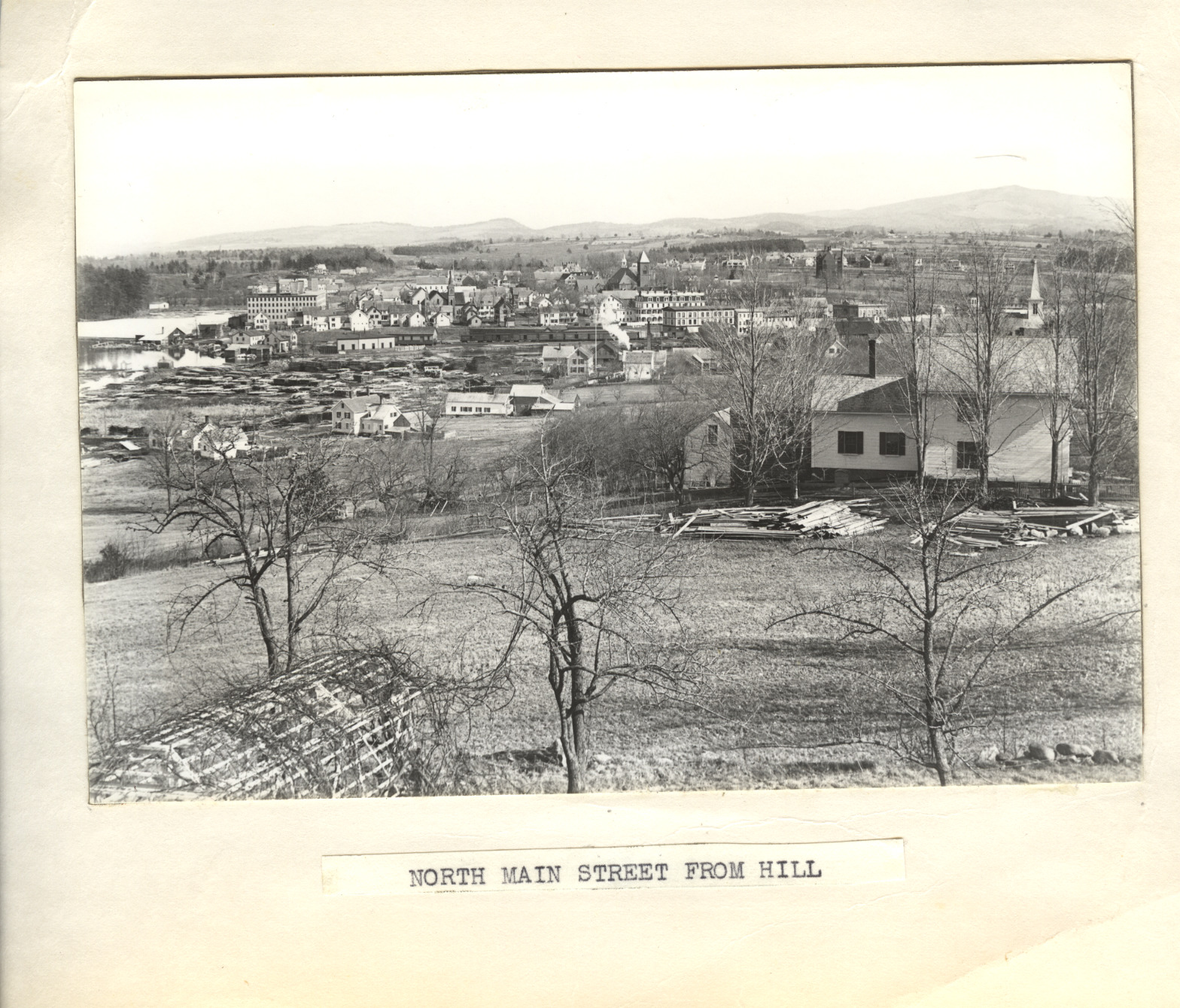 The caption on this photo is limited and incomplete. This photo appears to be taken from a farm in the area of Dead Horse Hill, now site of a communications tower, looking southeast. North & South Main Streets run past the First Christian Church on the right and Town Hall in the upper center. Copple Crown Mt. is in the right background. The Shoe Factory is next to the water in the upper left, and if you expand the photo, the tall spire of the Unitarian Church on Glendon St. (now the Village Players theater) is left of center. The huge Clow's Sawmill is on the left and the two bodies of water separated by the railroad causeway clearly show the old Front Bay (now Back Bay) & the old Back Bay (now Foss Field). C. 1900.