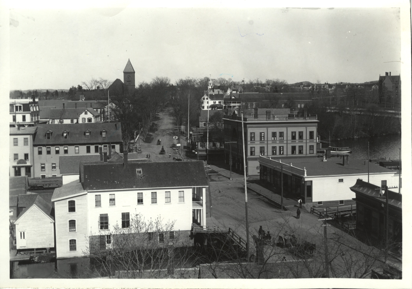 View from the Durgin Block looking south. On the right is the one-story building which replaced the former Goodwin Block building which burned in 1899. The Peavey Block is adjacent to it, and above the Peavey Block is the 100' long Samuel Avery Barn. On the left is the Wool Corner, the Bank Building and Town Hall. On the far right is Brewster Free Academy, which burned in Nov. 2, 1903. On the left and right, railroad cars are on Railroad Ave. and the dockside wharf. C. 1900.