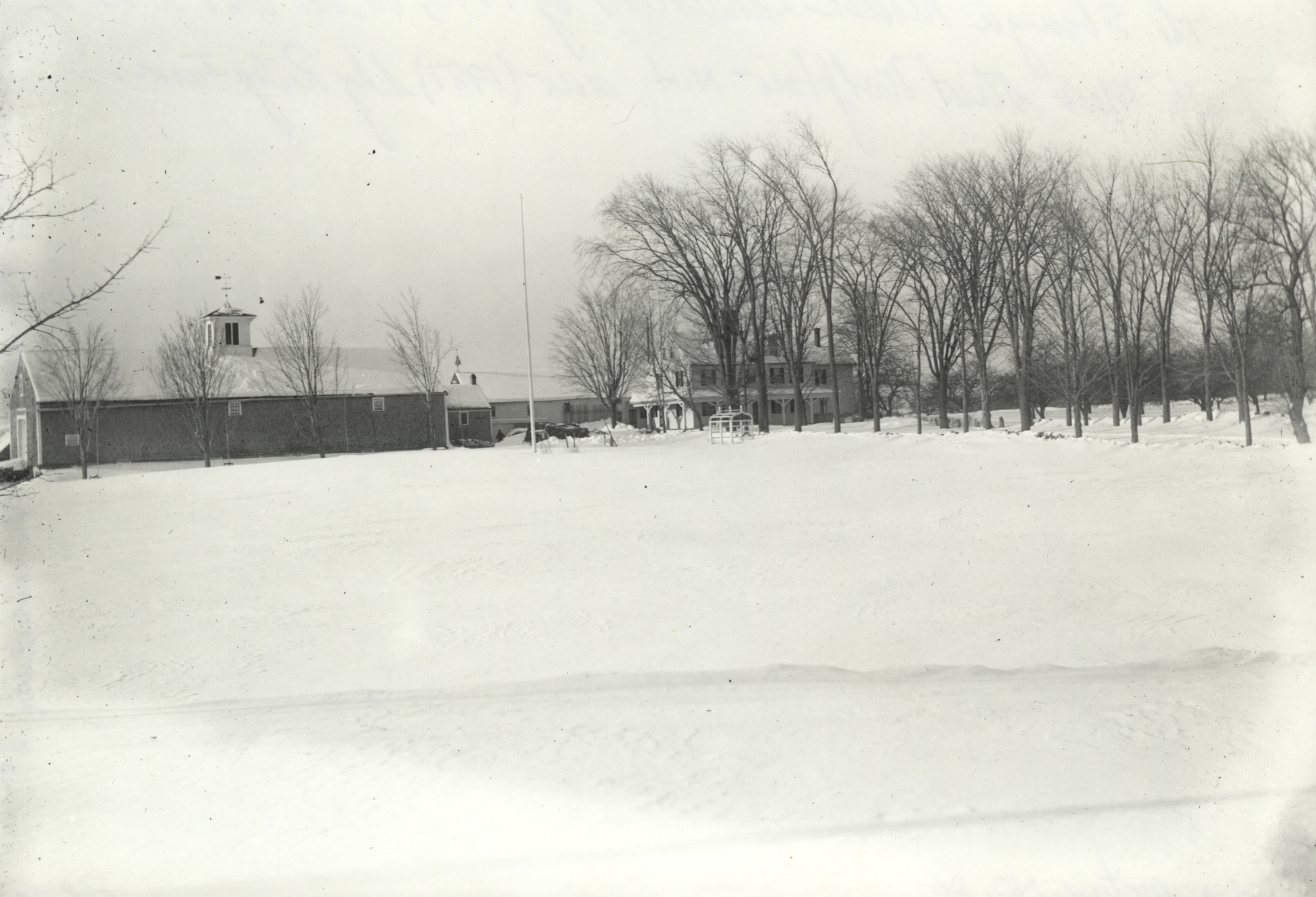 The Meader homestead on North Main St. near Forest Rd. was settlers farm No. 4. purchased by Ebenezer Meader about 1770. This photo shows the second barn on the property, built after the firest barn burned down on Sept. 30, 1902. This barn also burned down, on Sept. 8 1919. The location is now Sky Ridge Farms.