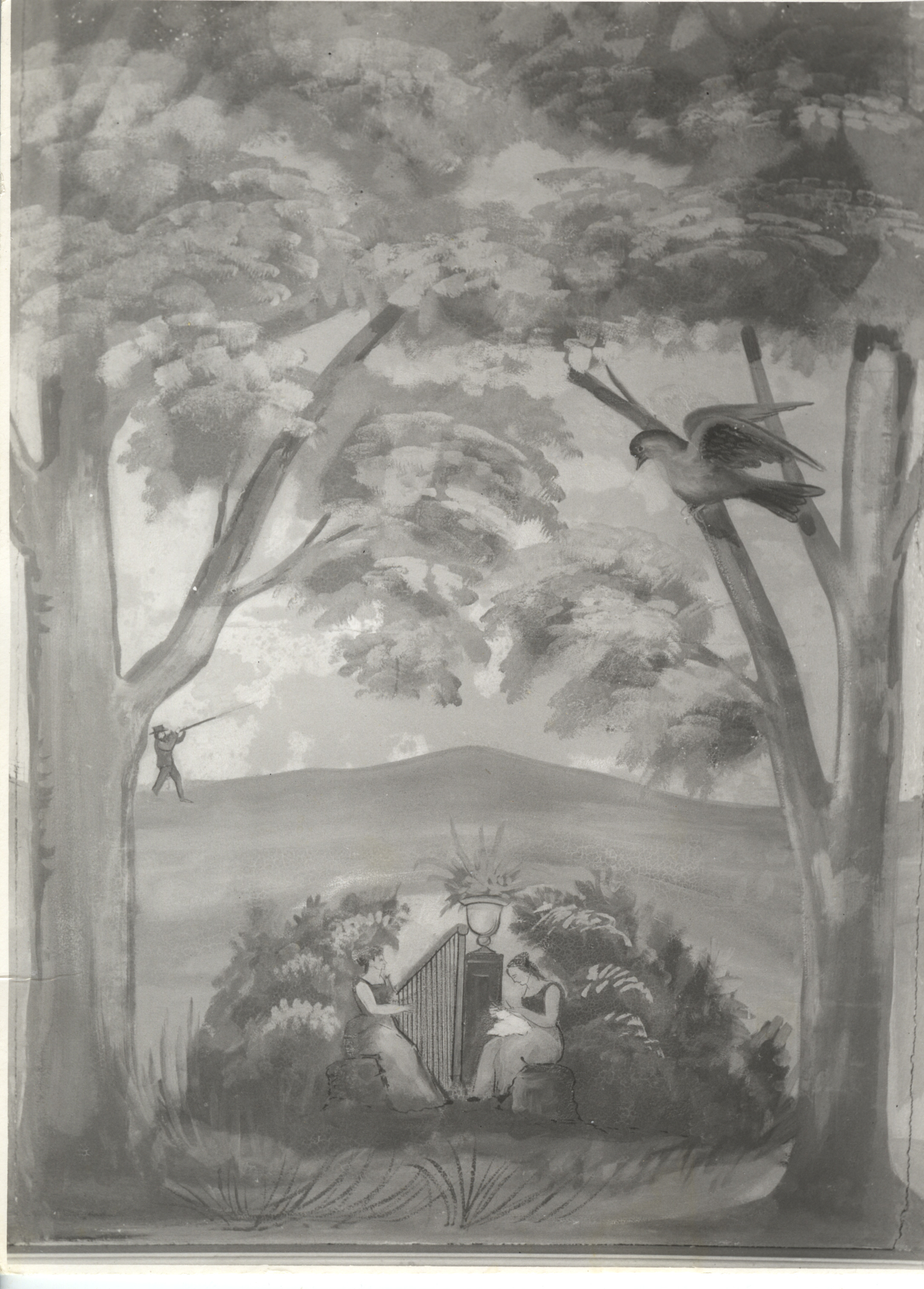 In the early 1800's, it was considered elegant to have large wall murals painted in the rooms where guests were entertained. Few of these survive today. Most of the work in Wolfeboro was done by an itinerant artist named John Avery, a relative of the prominent Avery family. This example is noted as possibly in the Stoddard house, which would have been in the Cotton Valley area.