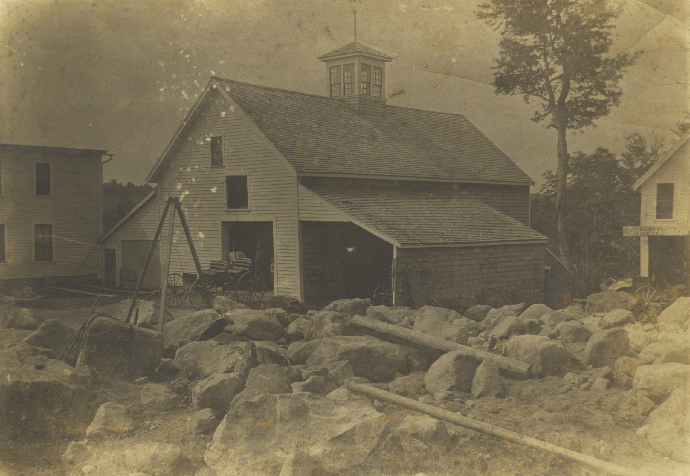 The Lorenzo T. Grant homestead, later owned by his son, Charles R. Grant, was located on South Main St. to the left of the South Wolfeboro Schoolhouse. This is their livery barn, operated by several generations of the family. All buildings were torn down by 1964.