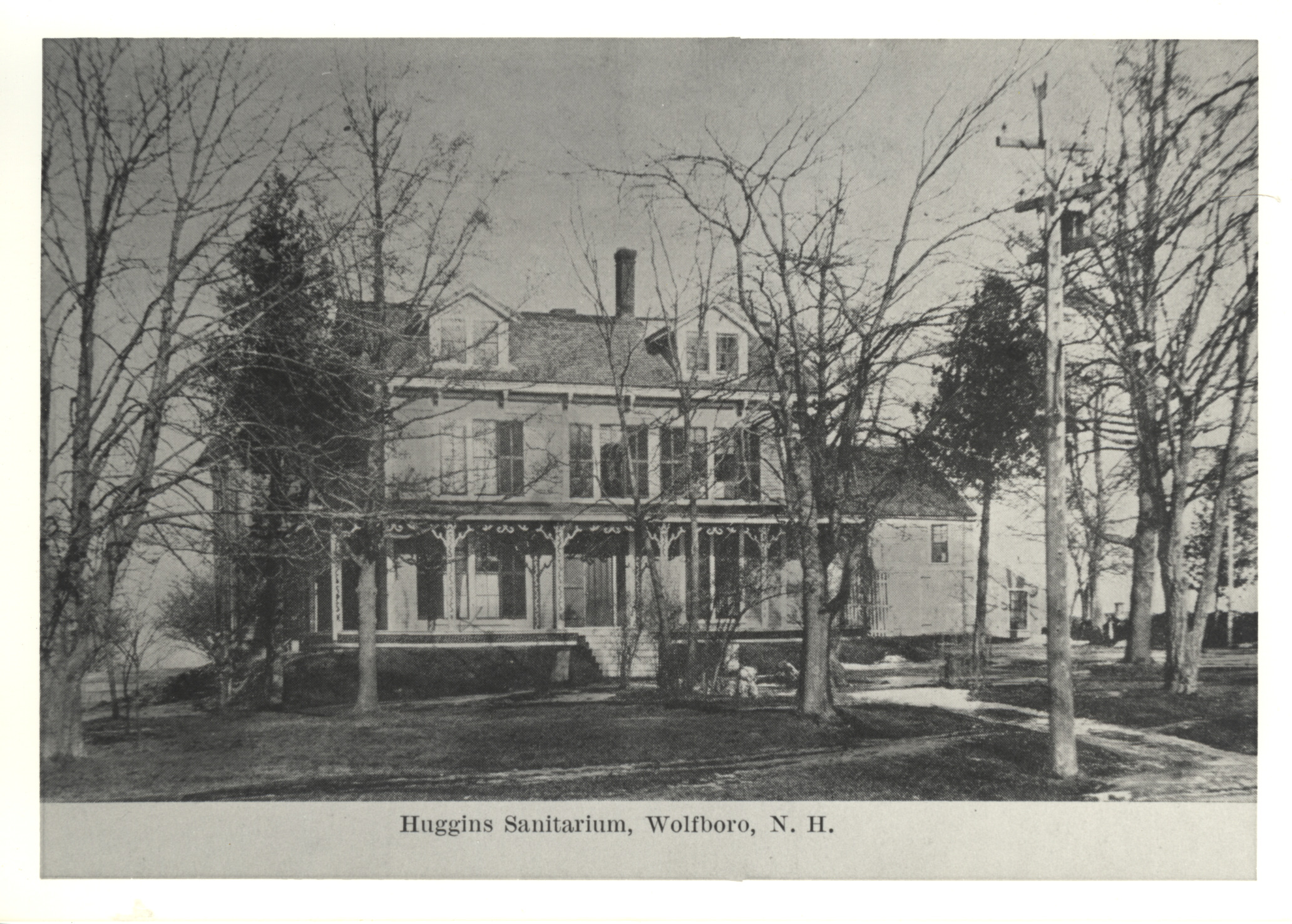 This is the Huggins Sanitarium, the first Hospital in Wolfeboro. Later called Huggins Hospital, it was the remodeled former homestead of Rev. Theodore C. Jerome, Pastor of the First Congregational Church, on South Main St., and had 12 beds. The location is where the High School is today. Opened in 1907, the building was used until replaced in 1924. The old building, now vacant, collapsed in 1935.
