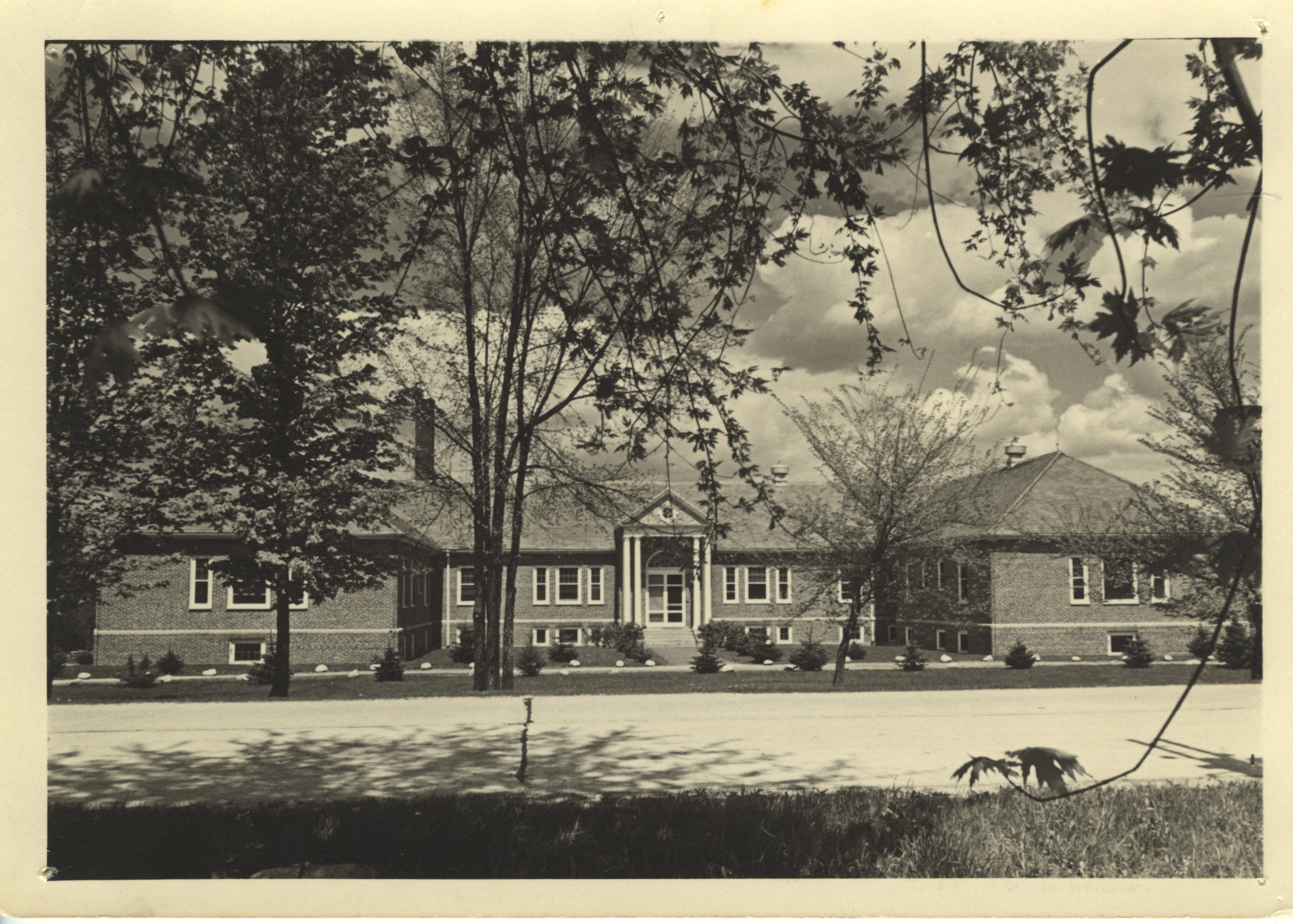 The red brick Huggins Hospital was dedicated on Nov. 11, 1924, on the present site. The land was previously a dairy farm, and was donated by George A. and Emma Carpenter. Built by J. Frank Goodwin and Andrew F. Doe, it had a 24 bed capacity. Photo is in 1950's; the front is about the same as built in 1924.