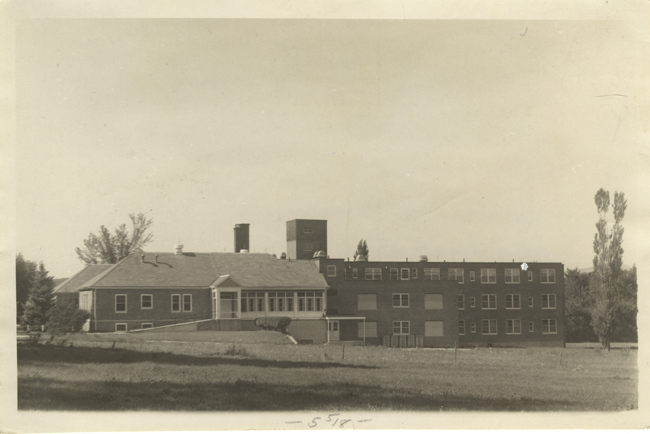 This view of Huggins Hospital's right side, shows the 1924 building on the left. In back of that is the flat-roofed addition, built in 1950, which increased the capacity to 66 beds.