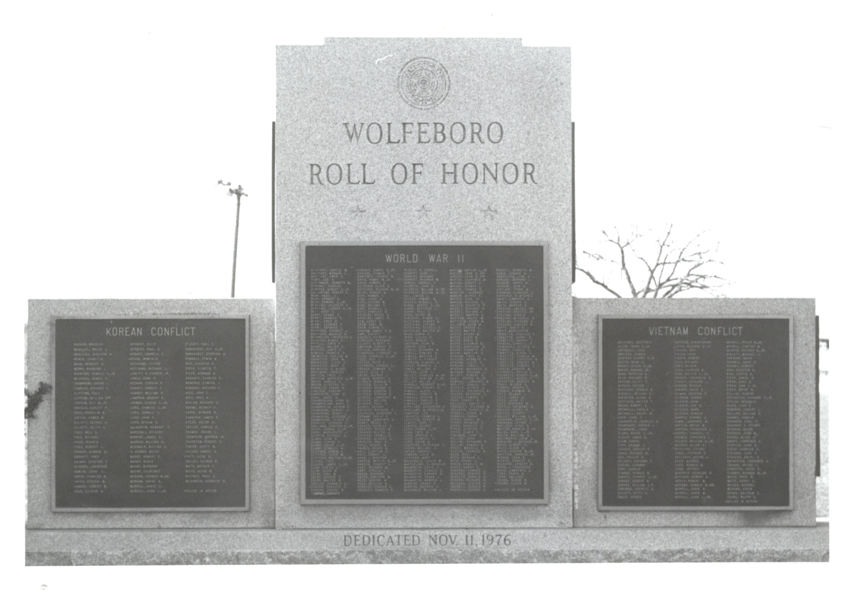 Wolfeboro Roll of Honor, Korean Conflict, World War II and Vietnam Conflict. Located at Pickering Corner, the Monument was dedicated on Nov. 4, 1976.