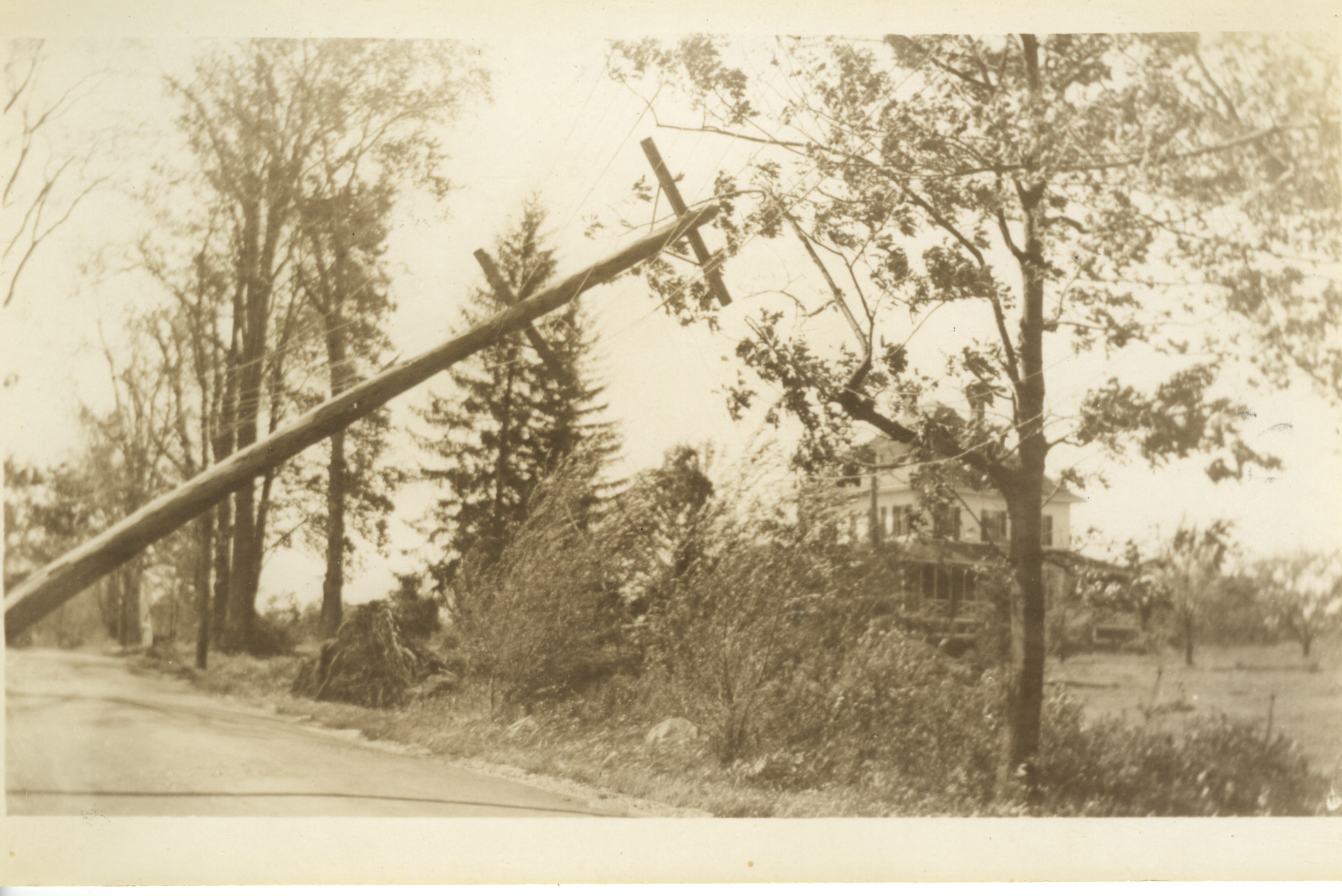 Sept. 21, 1938, hurricane. Electric pole blown down near Vinecroft on Forest Rd.