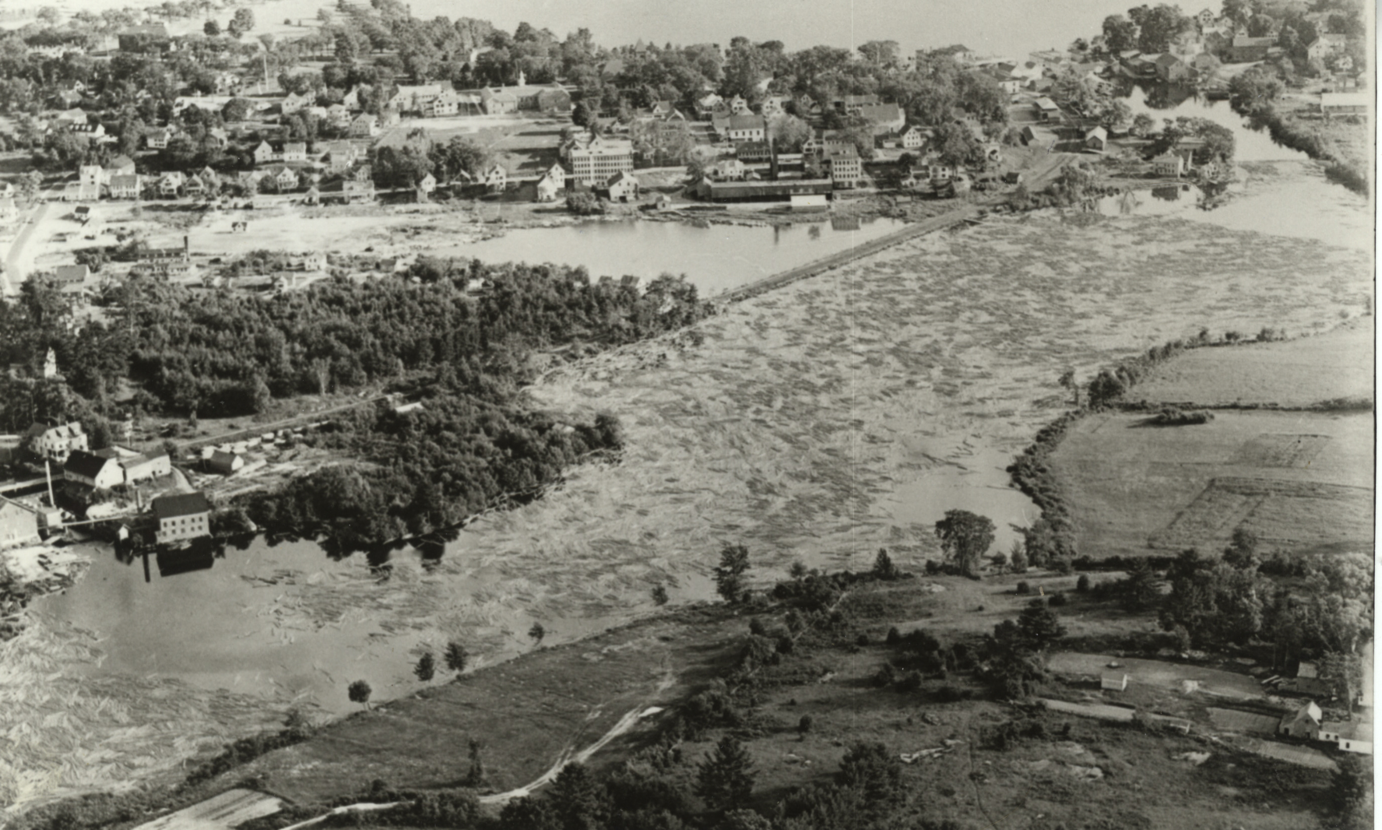 Sept. 21, 1938, hurricane. Logs completely fill Back Bay (then called Front Bay) waiting to be processed at the sawmill which is at the right end of the bay (not in this photo). The mills at Wolfeboro Falls are at the left end of the bay. Note the railroad causeway and the water above. This area was then called Back Bay, later filled in, and is now Foss Field.