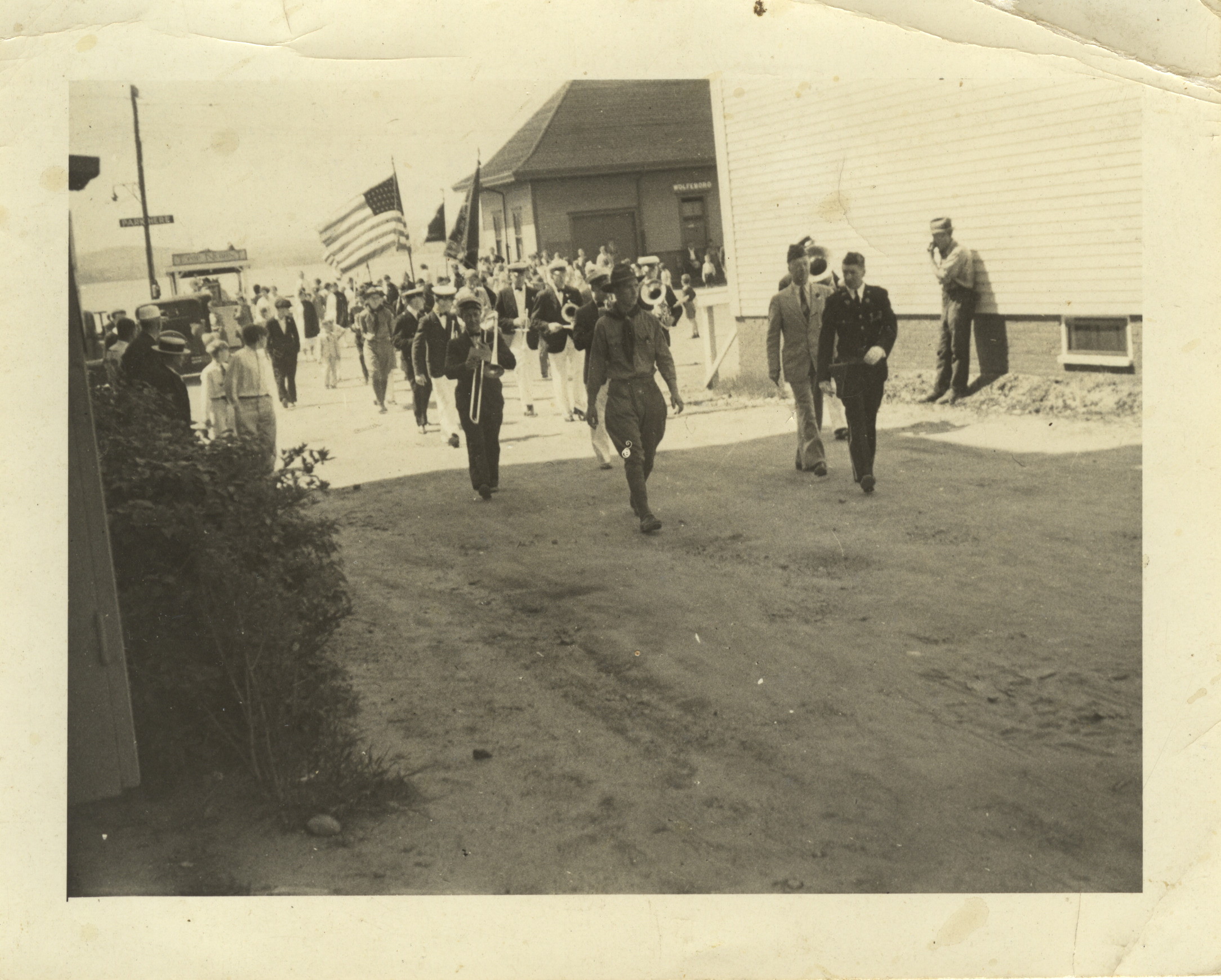 Memorial Day parade, 1937. American Legion, Women's Auxiliary and the Wolfeboro Band are leaving Dockside after a Marine Service. Dr. Barrow is leading, man in uniform on right is William Hildreth, an 8th grade teacher at Carpenter School.