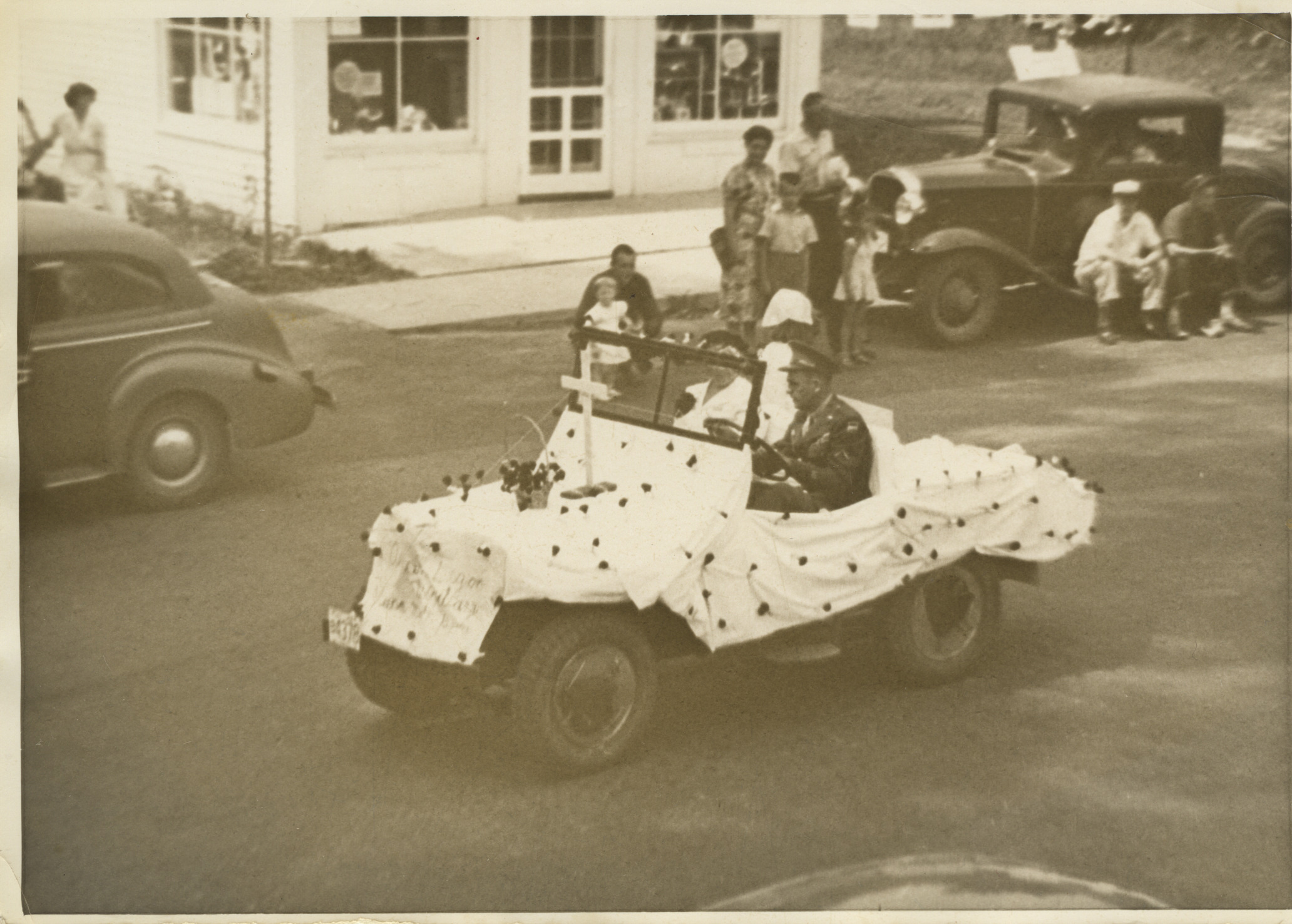 Unknown parade. Jeep with cross, likely Memorial Day.
