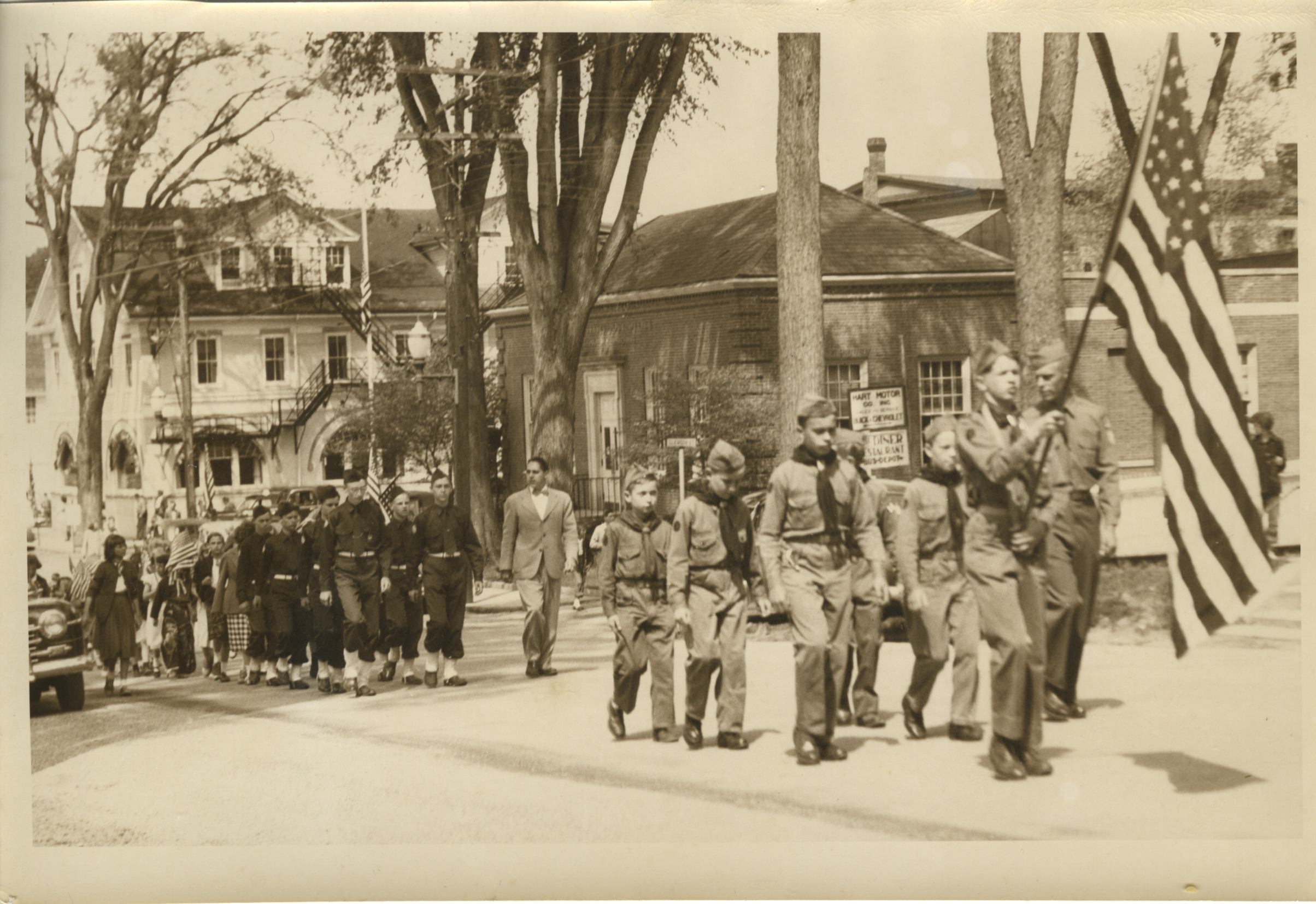 Scout groups are passing the Post Office heading toward Town Hall in an unknown parade. Bank Block is on the left. Not dated, but the Hart Motor Co. sign advertising the Buick and Chevrolet Dealer on Glendon St. and the pieces of cars showing suggest late 1940's.
