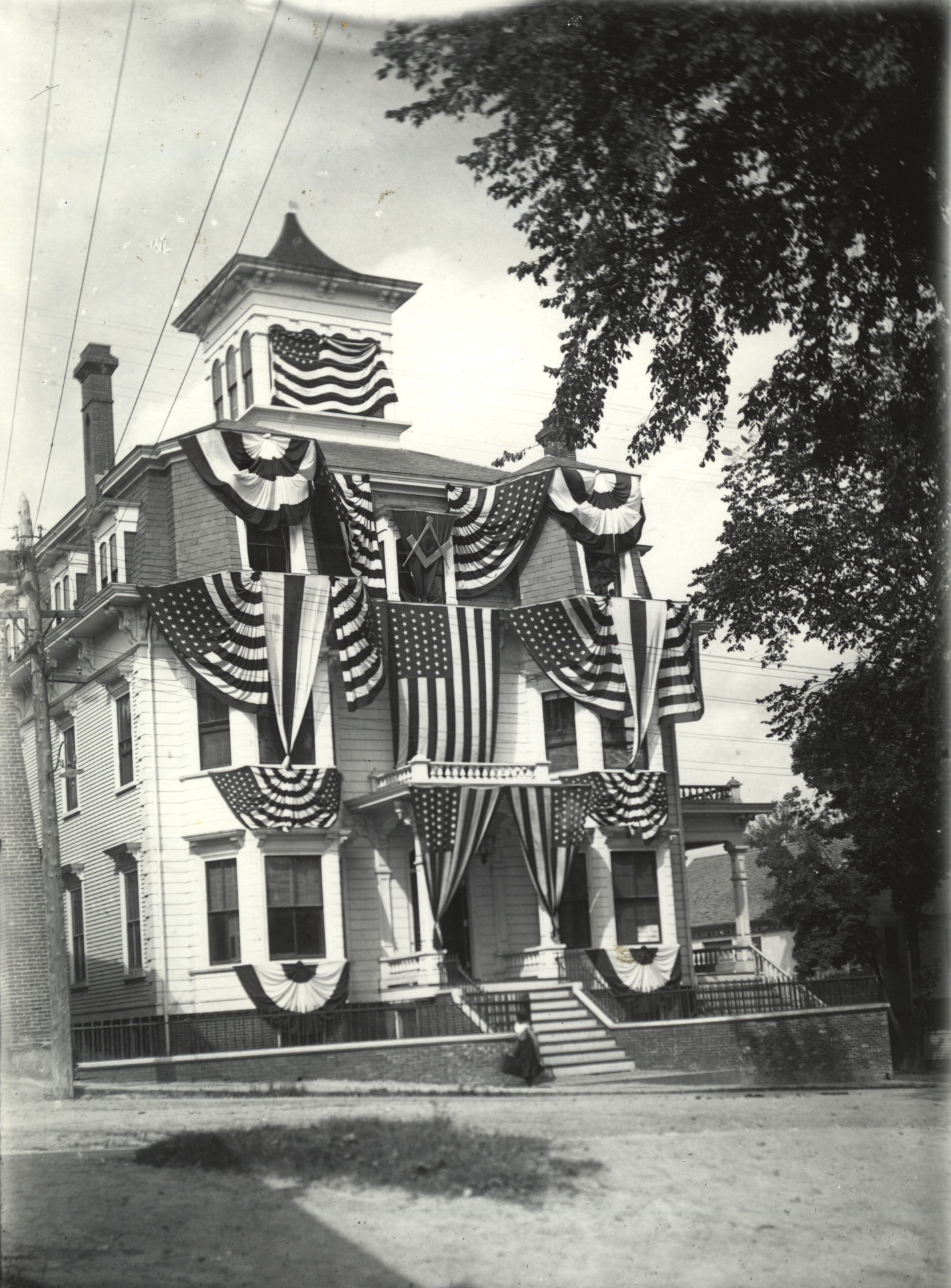 Durgin Block ready for Old Home Day, either 1901 or 1903. At the left is part of the "spite wall" erected in a dispute between Stephen Durgin and the owners of the adjacent somewhat lower quality Sheridan House (now the site of the Wolfeboro Marketplace).