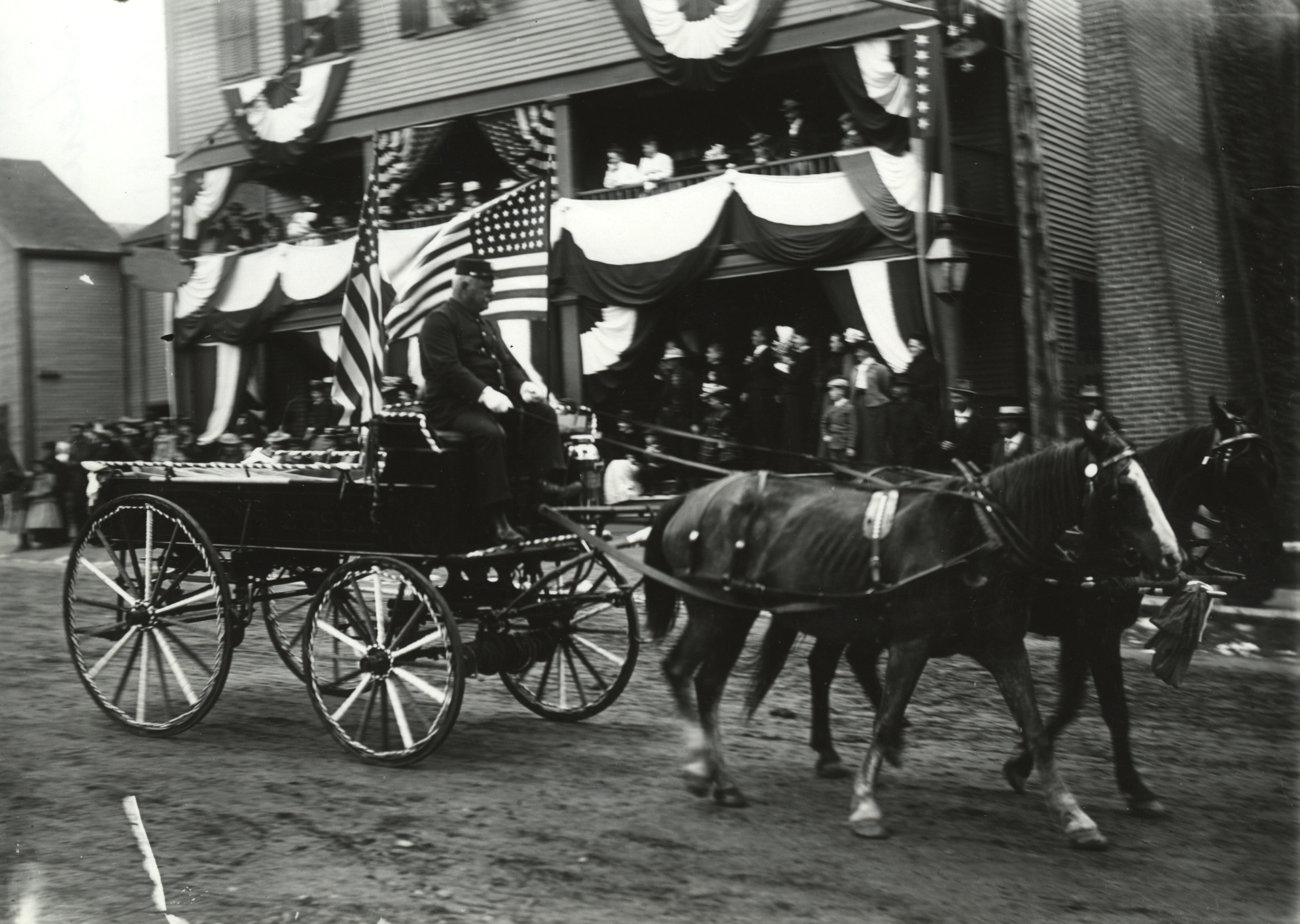 Old Home Day, c. 1900. Rollins Hose Co. No. 1 (volunteer Fire Department) hose wagon in front of Sheridan House (now site of Wolfeboro Marketplace). Driver is Addison Getchell. Spite wall at right separates the Durgin Building.