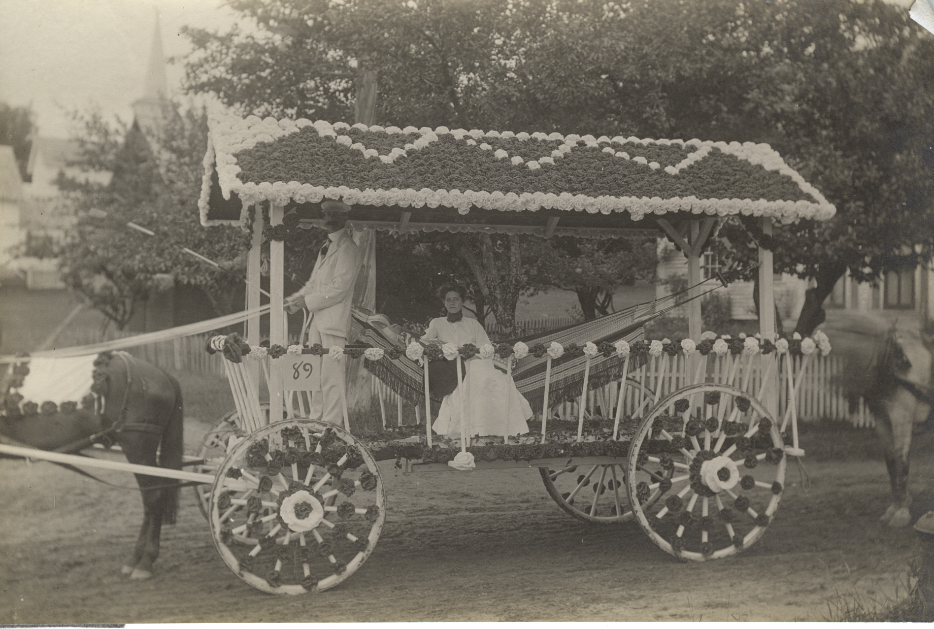 Old Home Day, c. 1900. Unknown group. Wagon depicts a garden shelter with hammocks.