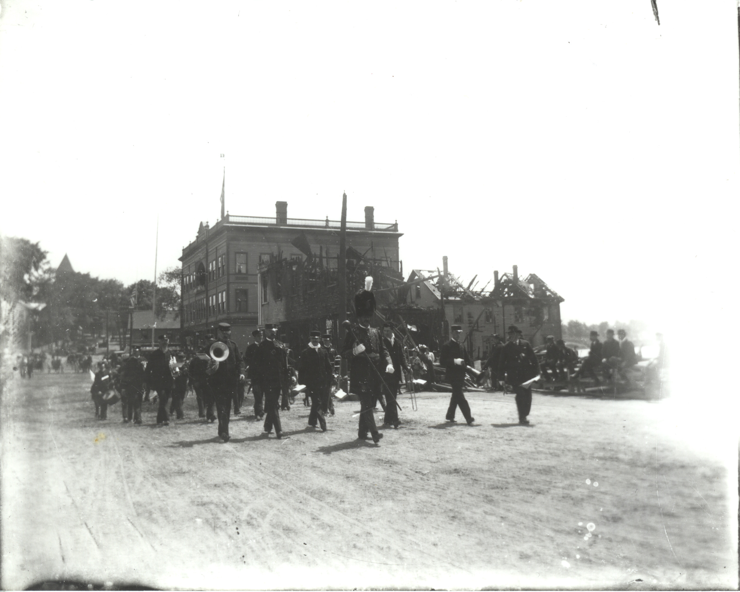 Unknown parade, Marching Band. C. 1899, taken after the Goodwin Block fire in May 1899 (ruins are on the right) and before the rebuilding later that year. The Peavey Block is in the background.