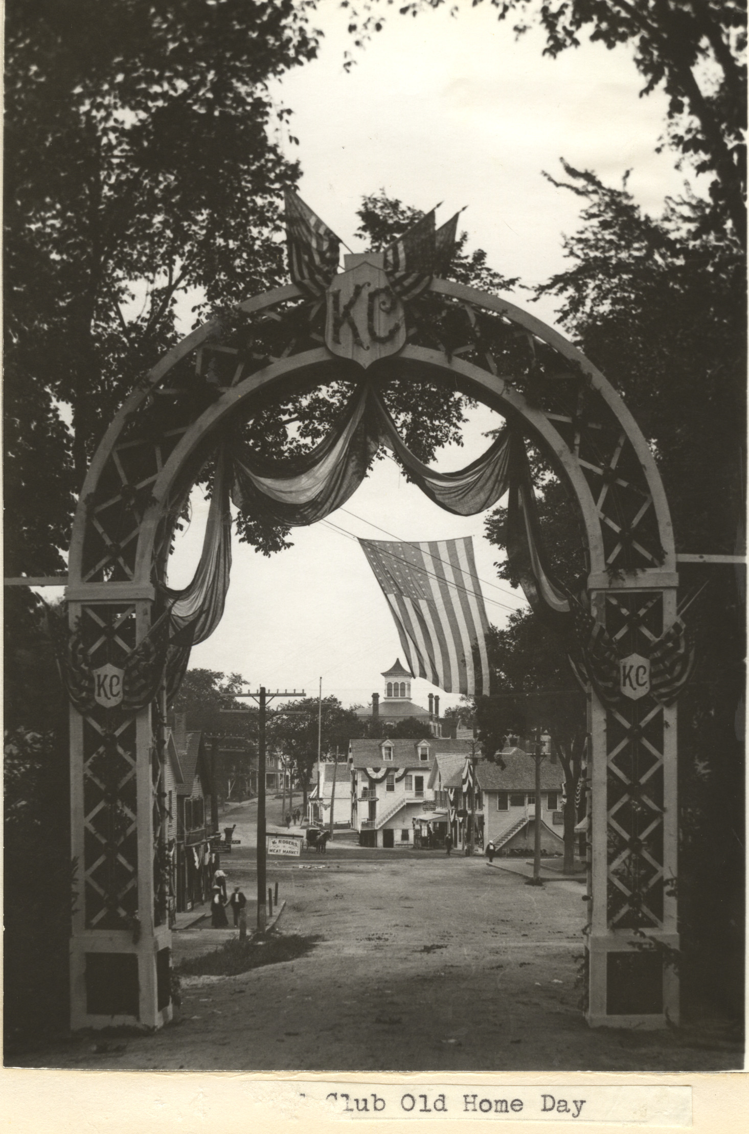 Old Home Day, August 20, 1901. Kingswood Club Arch on South Main St., looking northwest to the center of town. This group (not to be confused with the Golf Club) was a group formed in Mass. in Feb. 1901, dedicated to improving local facilities, including roads, train schedules and dock facilities. The huge temporary Arch spanned South Main St. at Glendon St. and had a 3 x 3 foot base, was 16 feet wide, 24 feet high and illuminated with 80 electric lights.