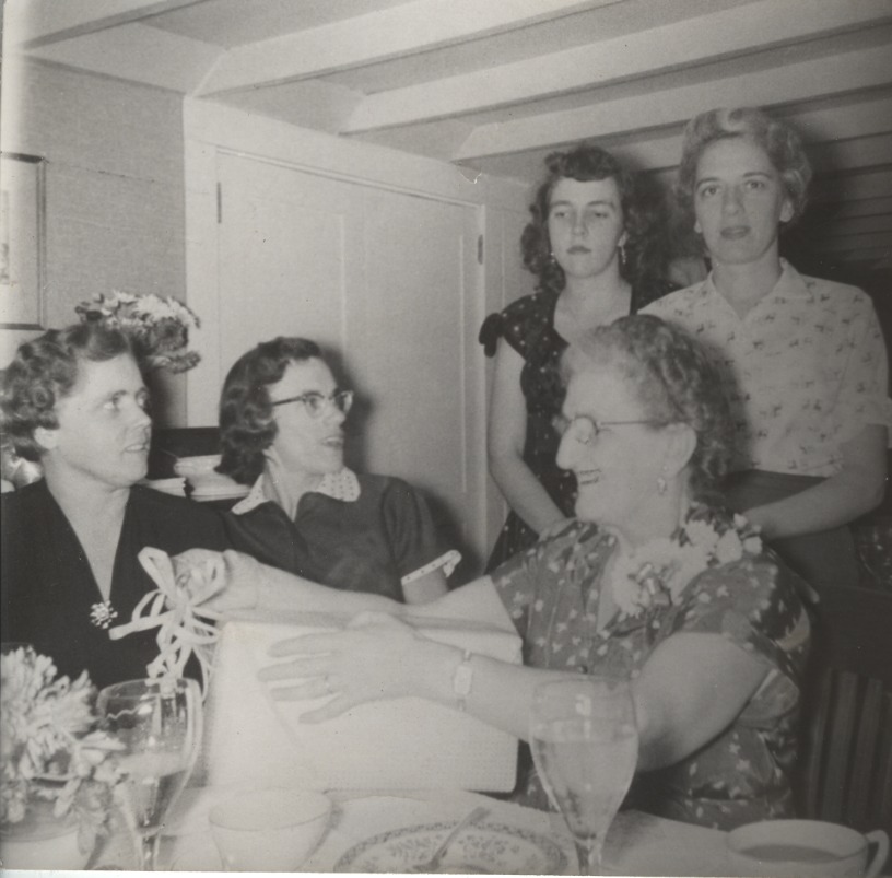 Louise Abbott's retirement from the telephone office. L-R, Mary Osgood, Hazel Chamberlain, unknown, Louise, Elizabeth Glidden.