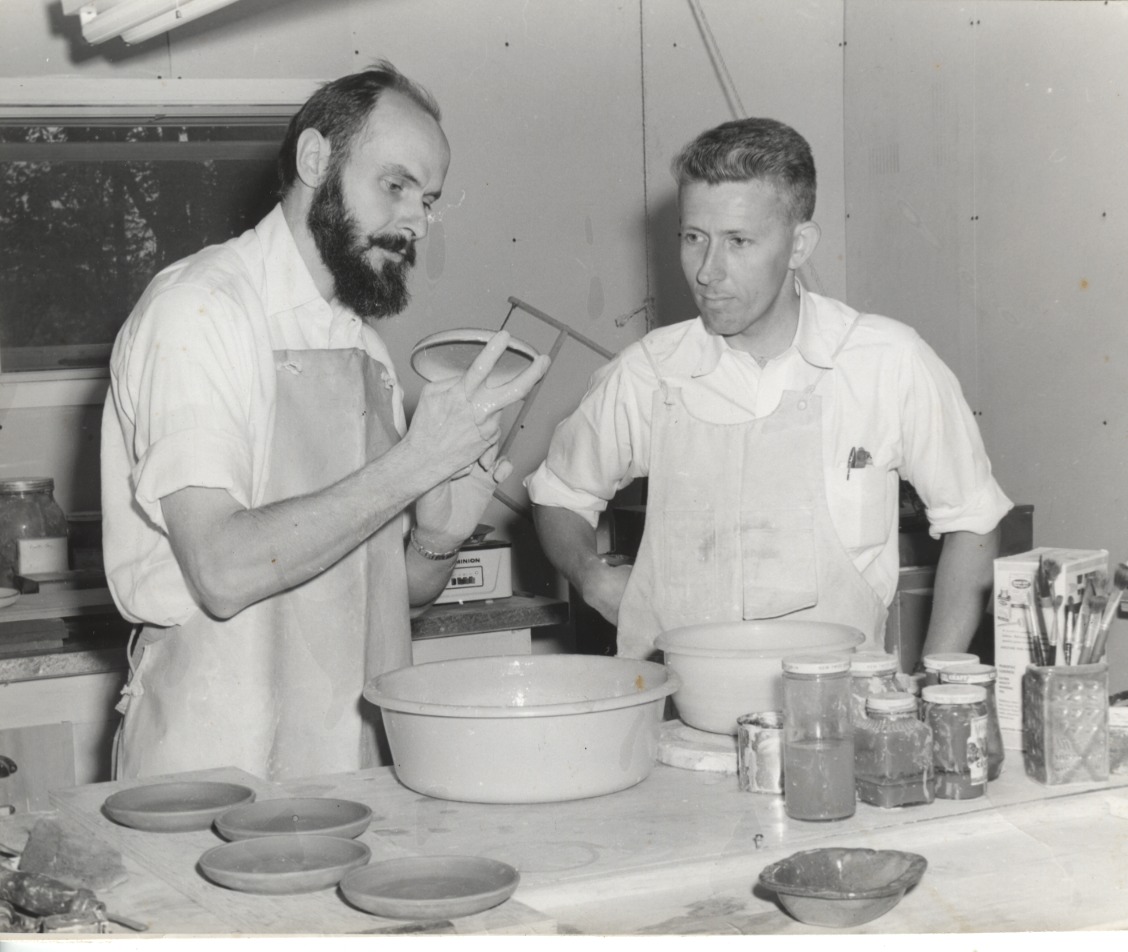 L-R, pottery maker and instructor John Emery of Springvale, Maine, is inspecting the work of Nelson P. Glidden, in Nelson's shop in South Wolfeboro. C. 1960's. Nelson made items including bowls, platters and ashtrays. In addition to selling from his home, some of his products were sold in the League of New Hampshire Craftsmen shops.