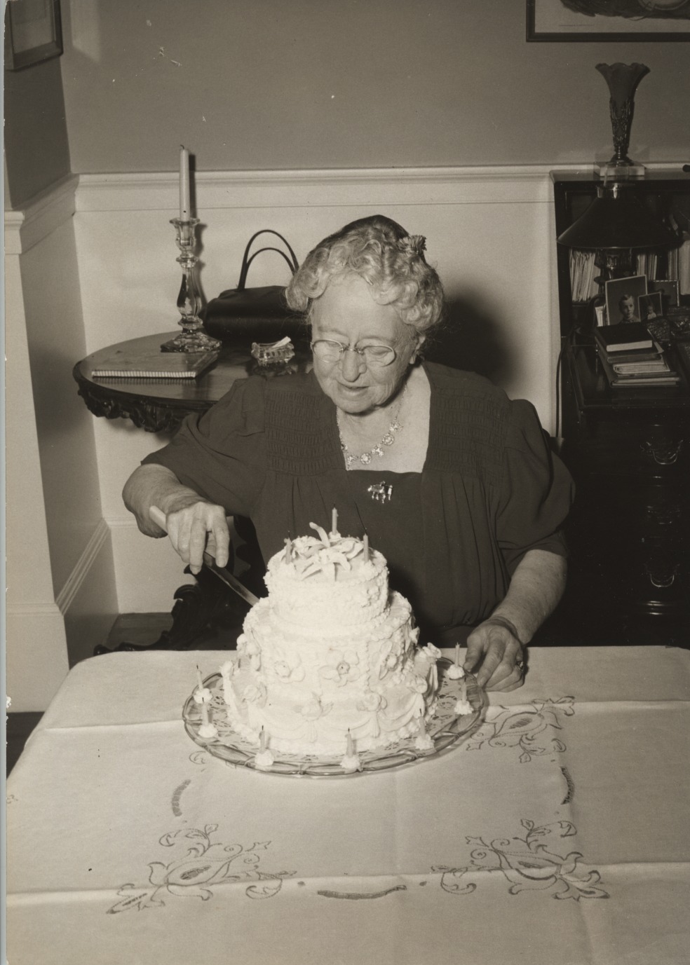 Mrs. Ella Lord Gilbert on her 80th birthday, Nov. 17, 1958. She founded the Amy Cheney Beach Club, known today as the Friends of Music. This group brought many noted performers to town over many years. Mrs. Gilbert gave music lessons at her Pleasant St. home known as Harmony Cottage.