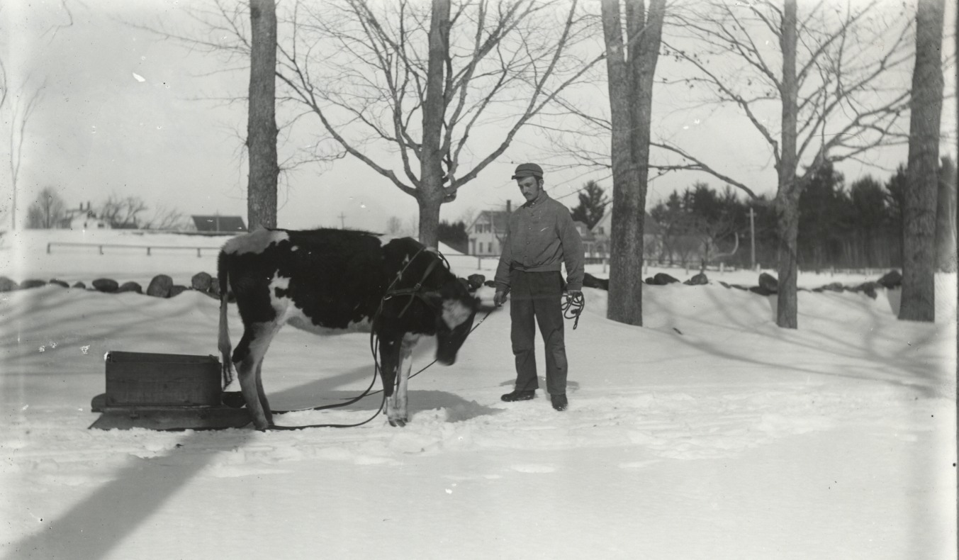 Harry Meader, with calf taking log back to the homestead on the left background.
