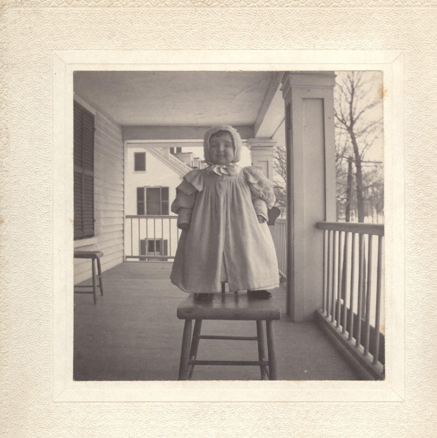 An unknown Meader or Whitton child on the upper porch of the old Avery Store on South Main St. Background is south toward Pickering Corner.
