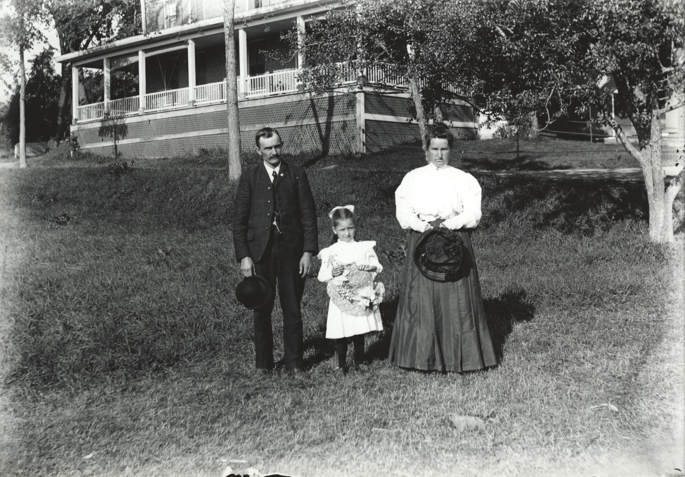 William L. Sawyer, wife Bertha and daughter Carrie. Taken on the grounds of the Lake View Hotel, now Cate Park and Town Park. Taken 1907.