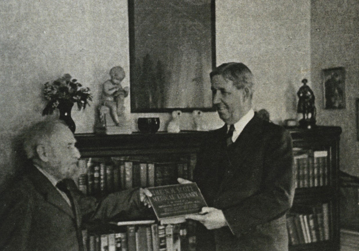 Dr. Nathaniel H. Scott, left, receiving a Huggins Hospital plaque from Judge William Britton.