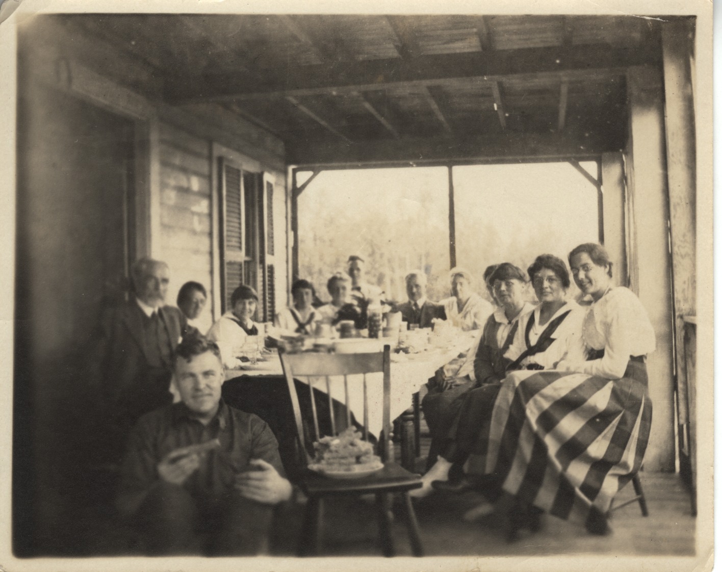 Picnic at Scott Camp, later known as "Fort Courage". Clockwise from lower left - Lee Cunningham, Dr. Scott, Louisa Scott, Kathleen Cunningham, Ethel Scott (Wallace), Mrs. Scott, Natt Scott, Father, Mother, Aunt Lil, Edith Scott (Tinker), Dora Scott (wife of N. H. Scott, son).