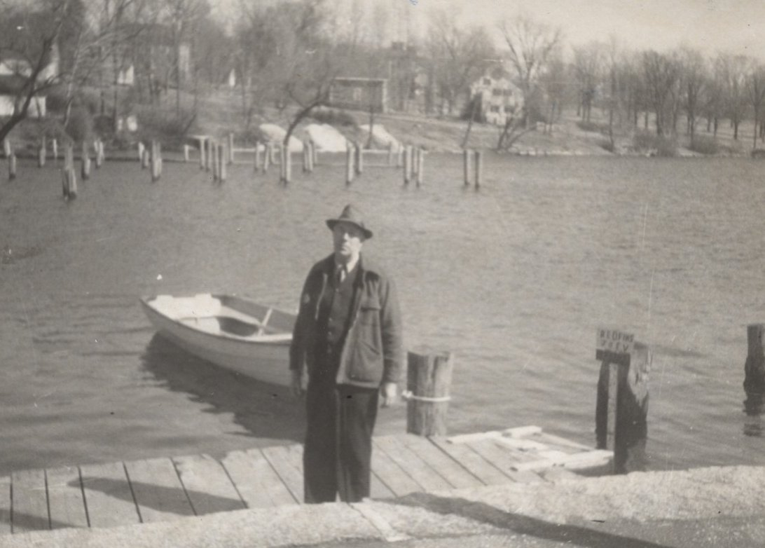 Police Chief Harold Thompson at the Town Docks, 1958, during high water.