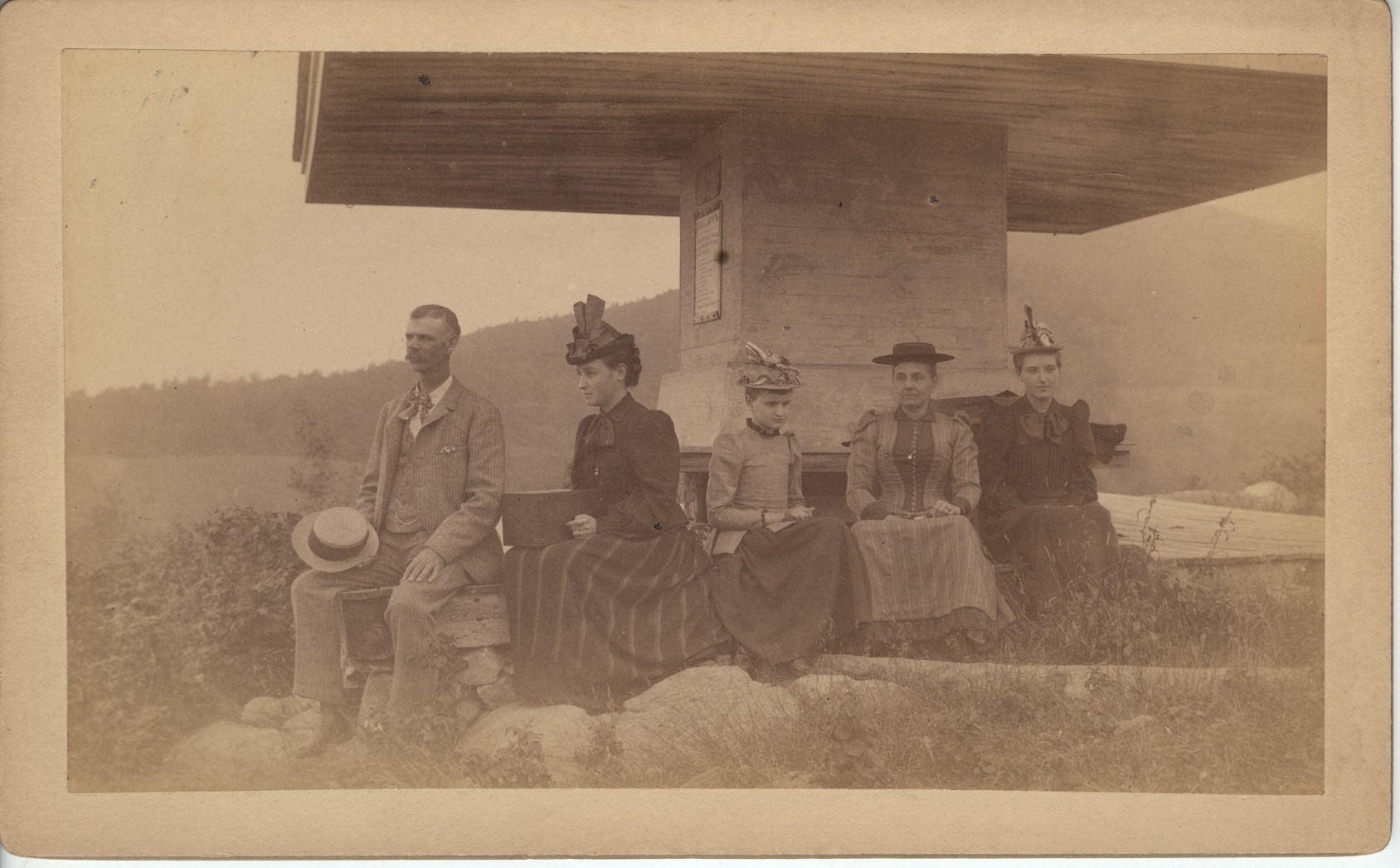 Picnic area atop Mt. Shaw, known as the Crow's Nest. A steep path took them to the peak by horse and buggy from the area where Castle in the Clouds is today. L-R, Frank Ladd (Fred's father), Sarah Whitton, Louella Whitton, Mrs. Frank Ladd, Esther Whitton. C. 1895.br>