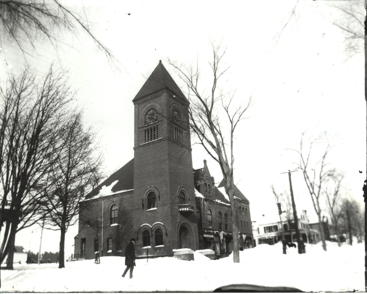 Brewster Memorial Hall, winter, before 1924, when the two residences on the right were moved to make room for Carpenter School.