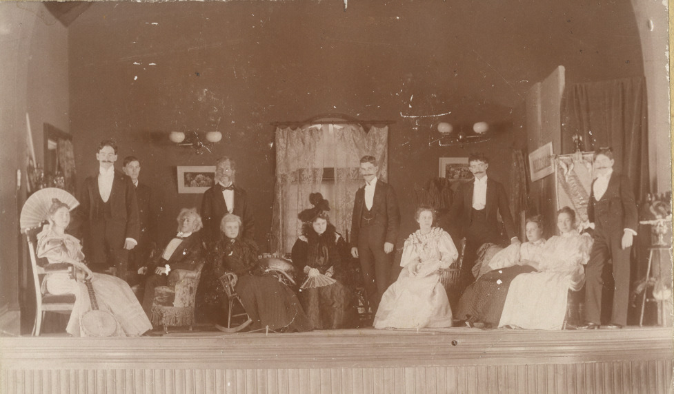 Brewster Memorial Hall, play on the second floor. Seated, L-R, Bertha May Stevens, Harry Moulton Lee, Clara Luella Whitton, Maude May Freeman, Emma Chesley Tobin, Ida Louie Sanborn, Clara May Pitman. Standing, L-R, Austin Phelps Christy, Jr., James Nelson Cooke, Fred Chamberlain Tobey, Edwin Harris Mattison, Frank Leon Warren, Carl Samuel Dorr. C. early 1900's.
